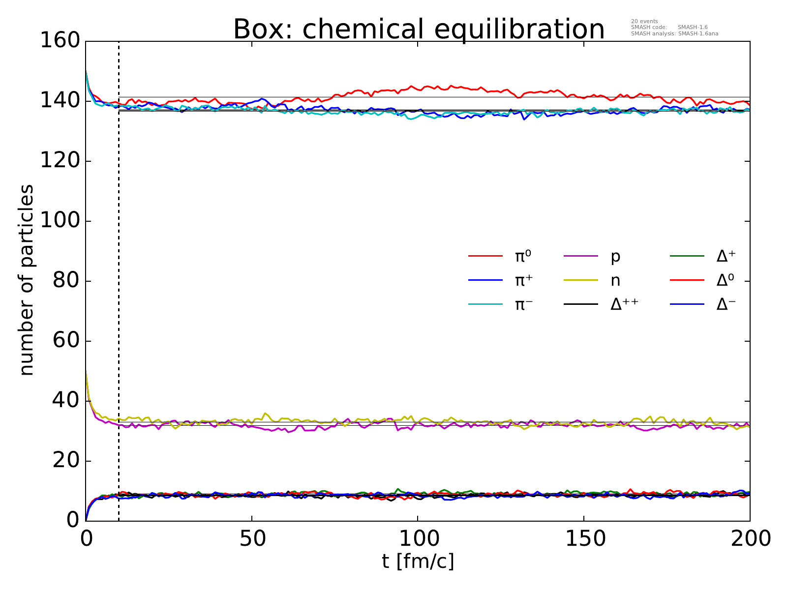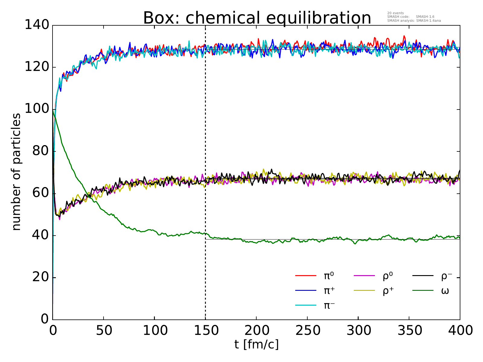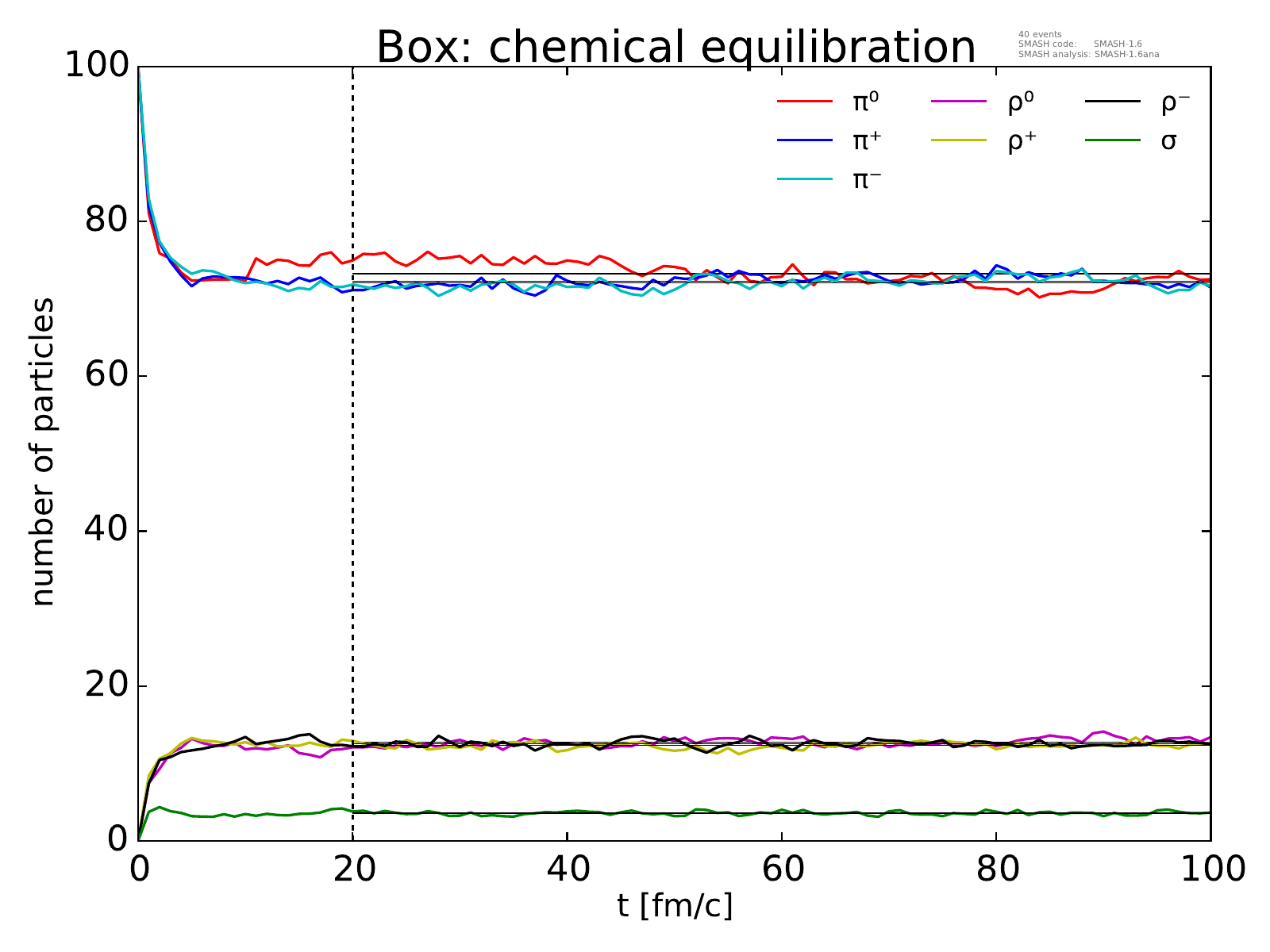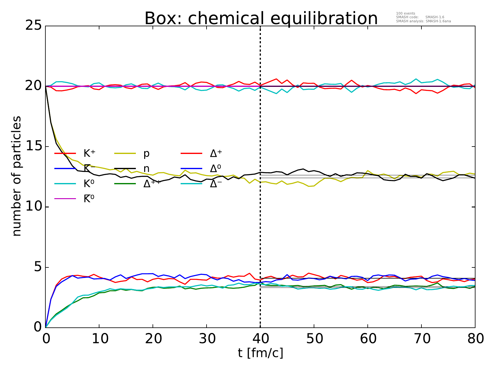 On the left, the evolution of the box towards chemical equilibrium is displayed for all particle species considered.