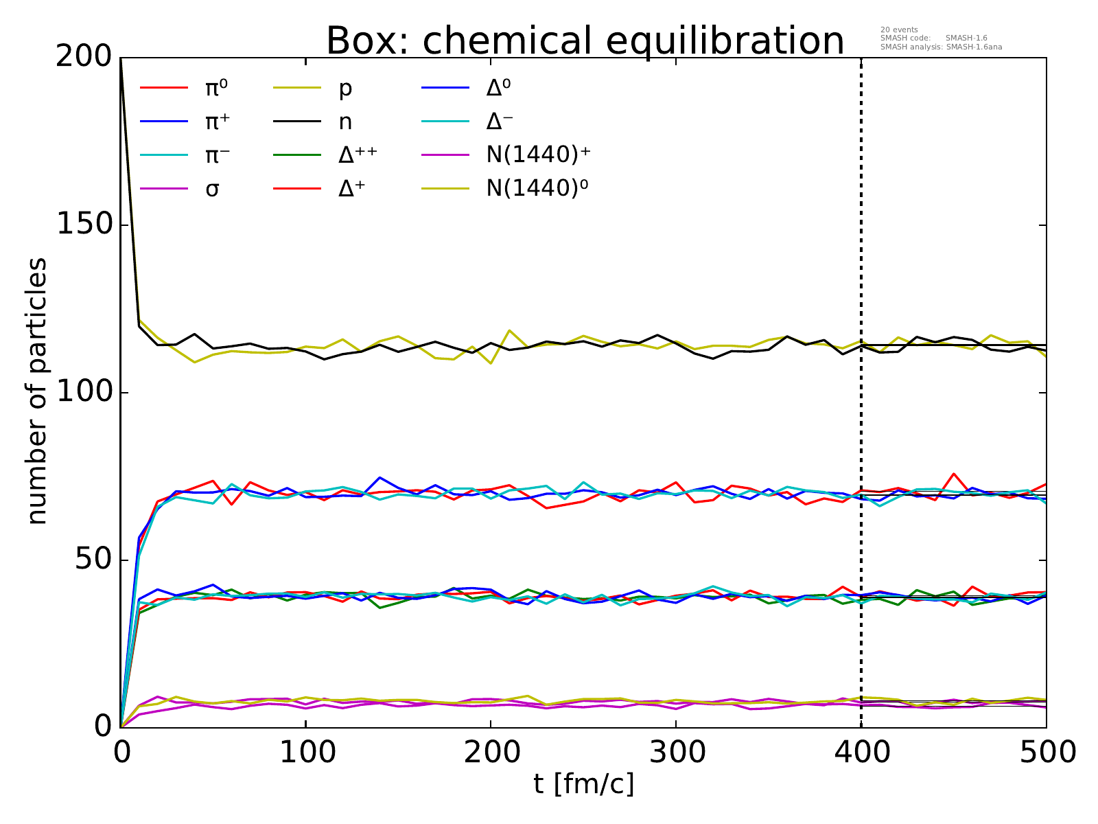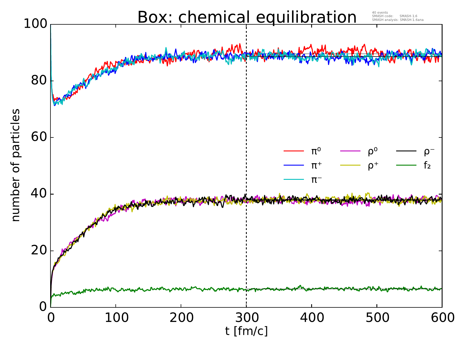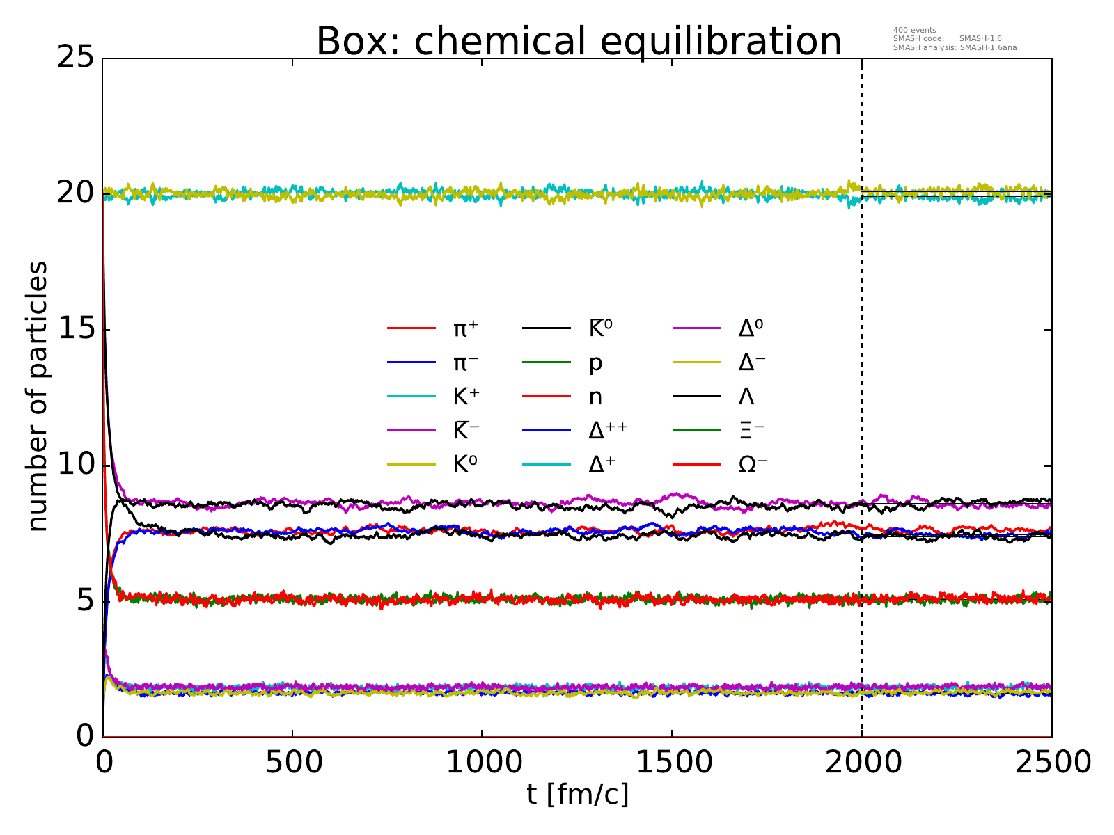 On the left, the evolution of the box towards chemical equilibrium is displayed for all particle species considered.