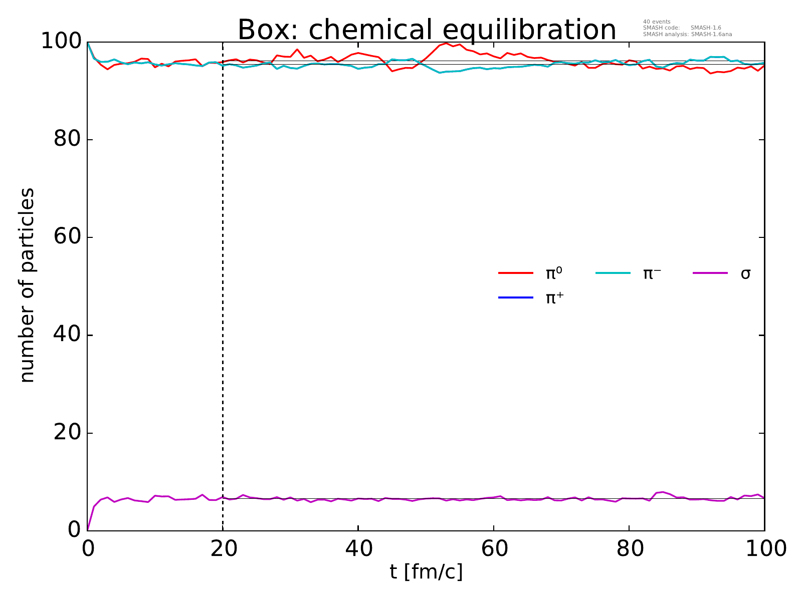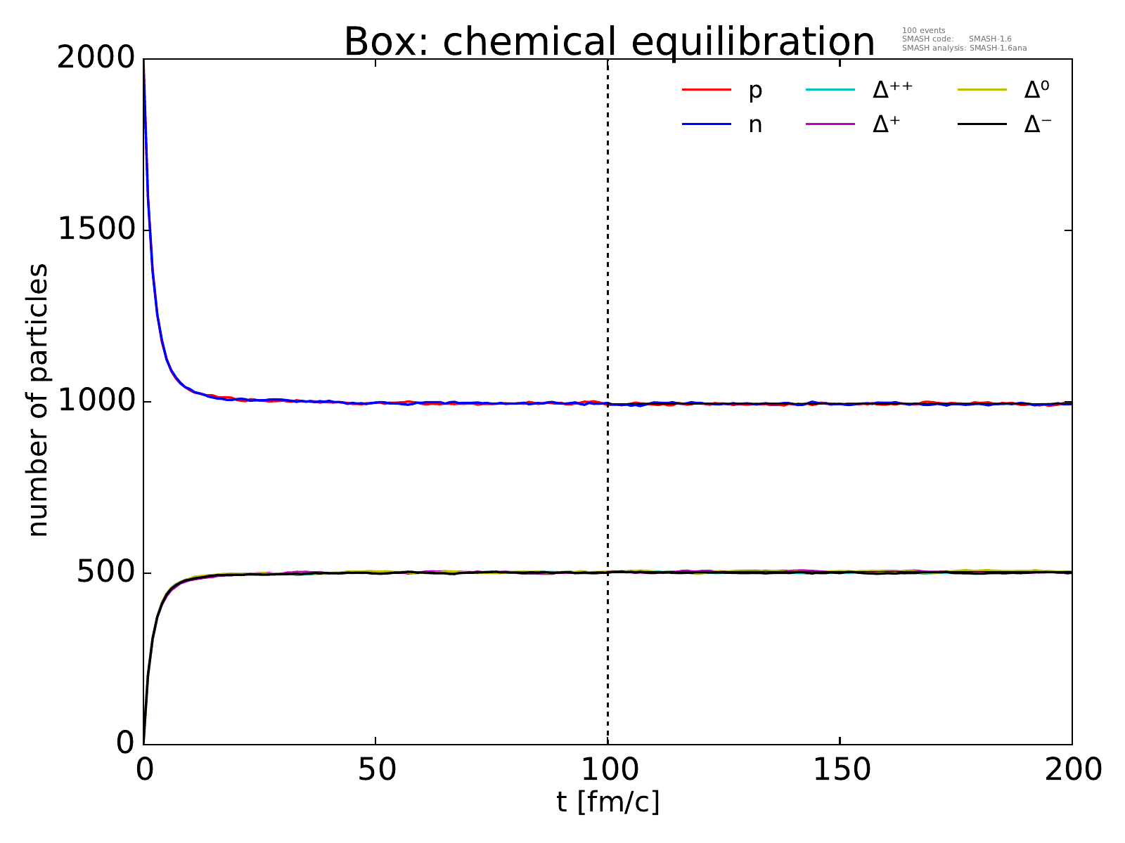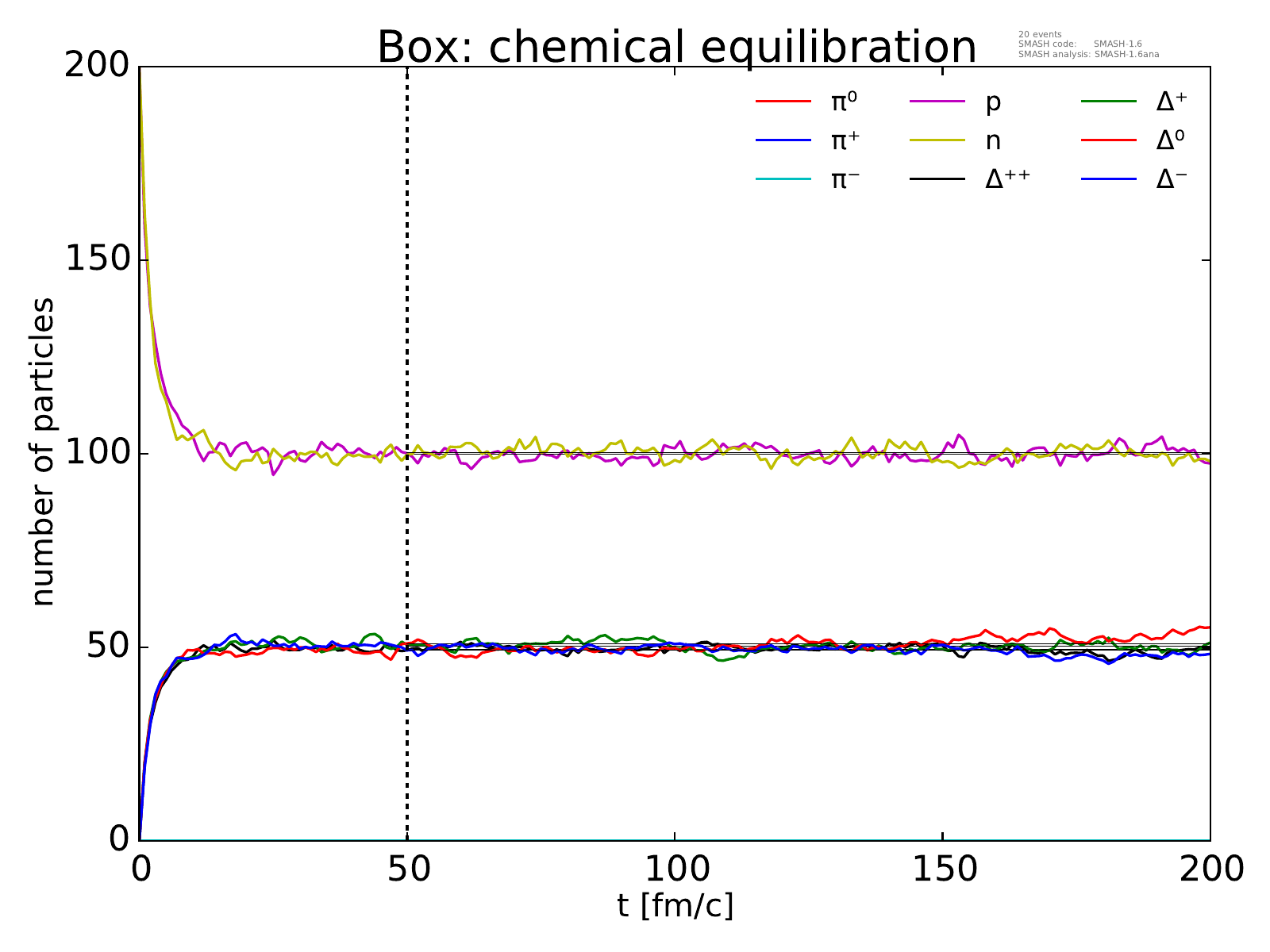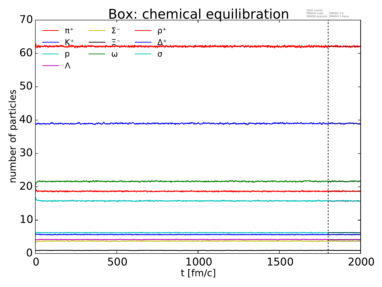 On the left, the evolution of the box towards chemical equilibrium is displayed for all particle species considered.