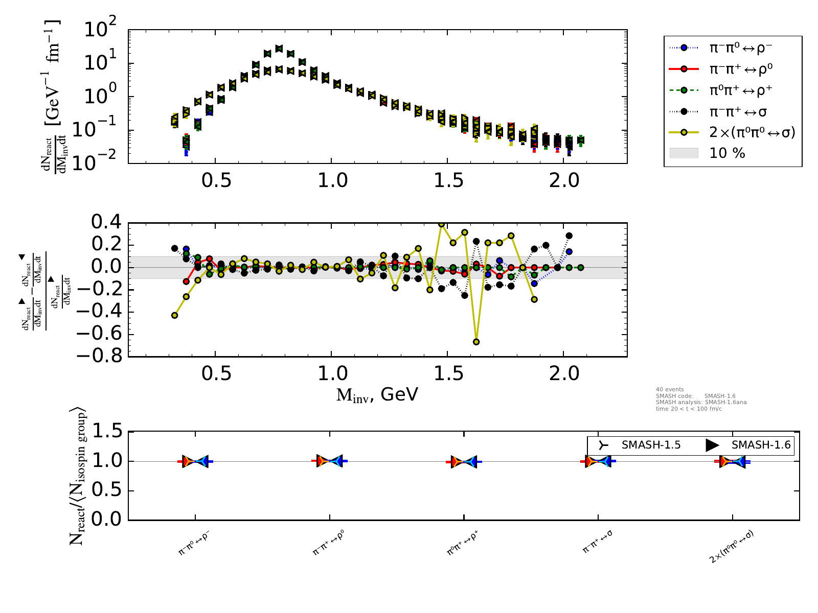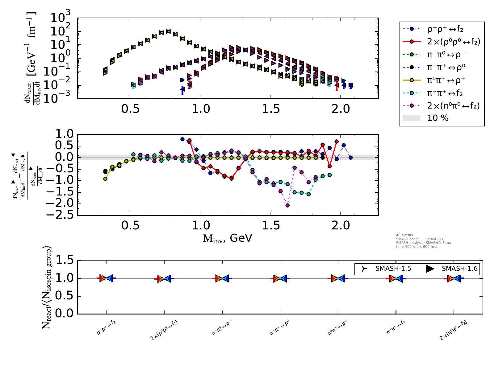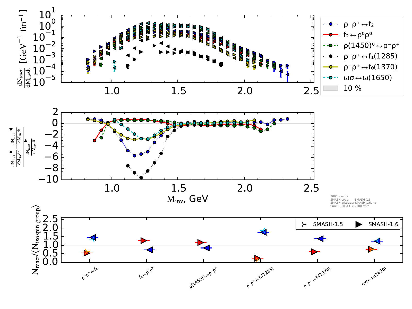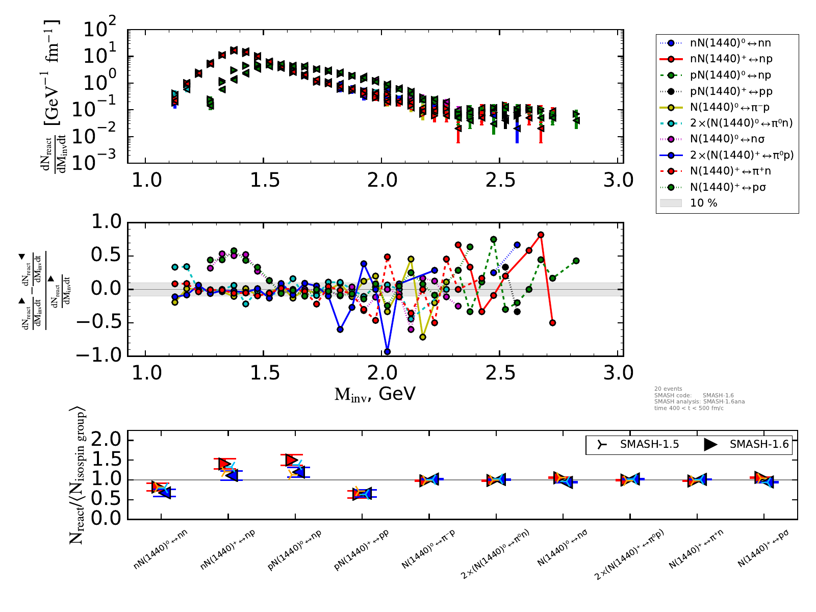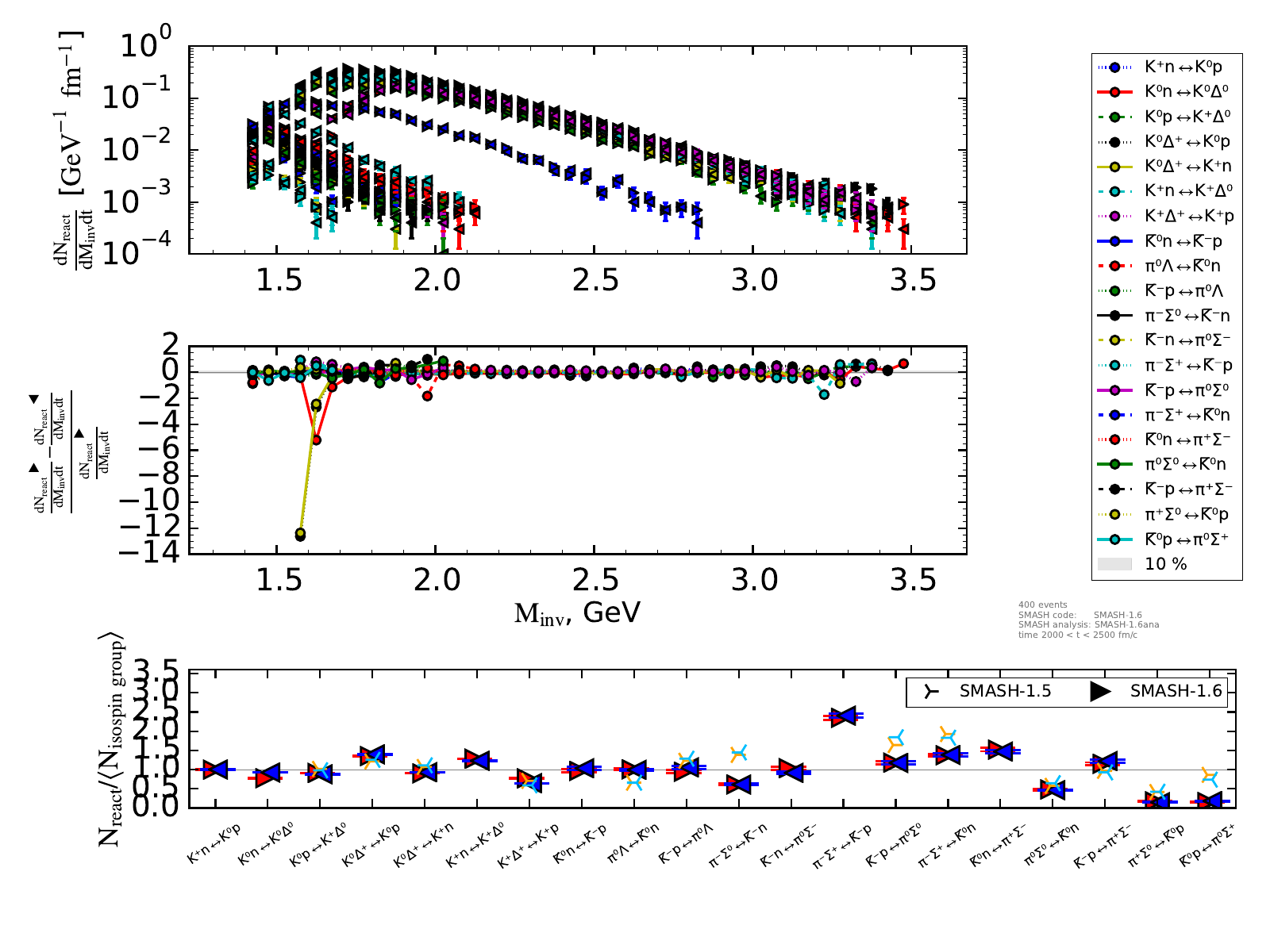 The upper plot on the right shows the number of reactions binned in invariant mass and normalized by the length of the timestep (endtime - onset of equilibrium).