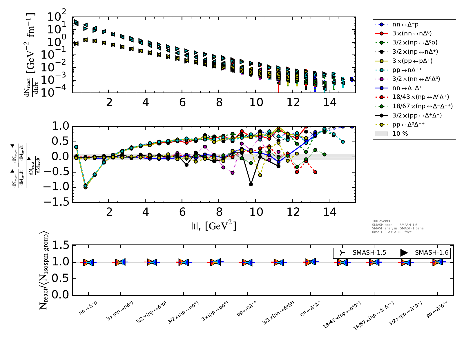 The lower plot on the right shows the numbers of most violating forward (tip to the right) and backward (tip to the left) reactions encountered in the corresponding setups. If detailed balance was perfectly conserved, the inwards and outwards arrows of each reaction should lie exactly on top of each other. To increase readabiliy, the total number of reactions for each channel is normalized by the average reaction number for the considered isospin group. Therefore, the normalized values are expected to lie at 1.0.