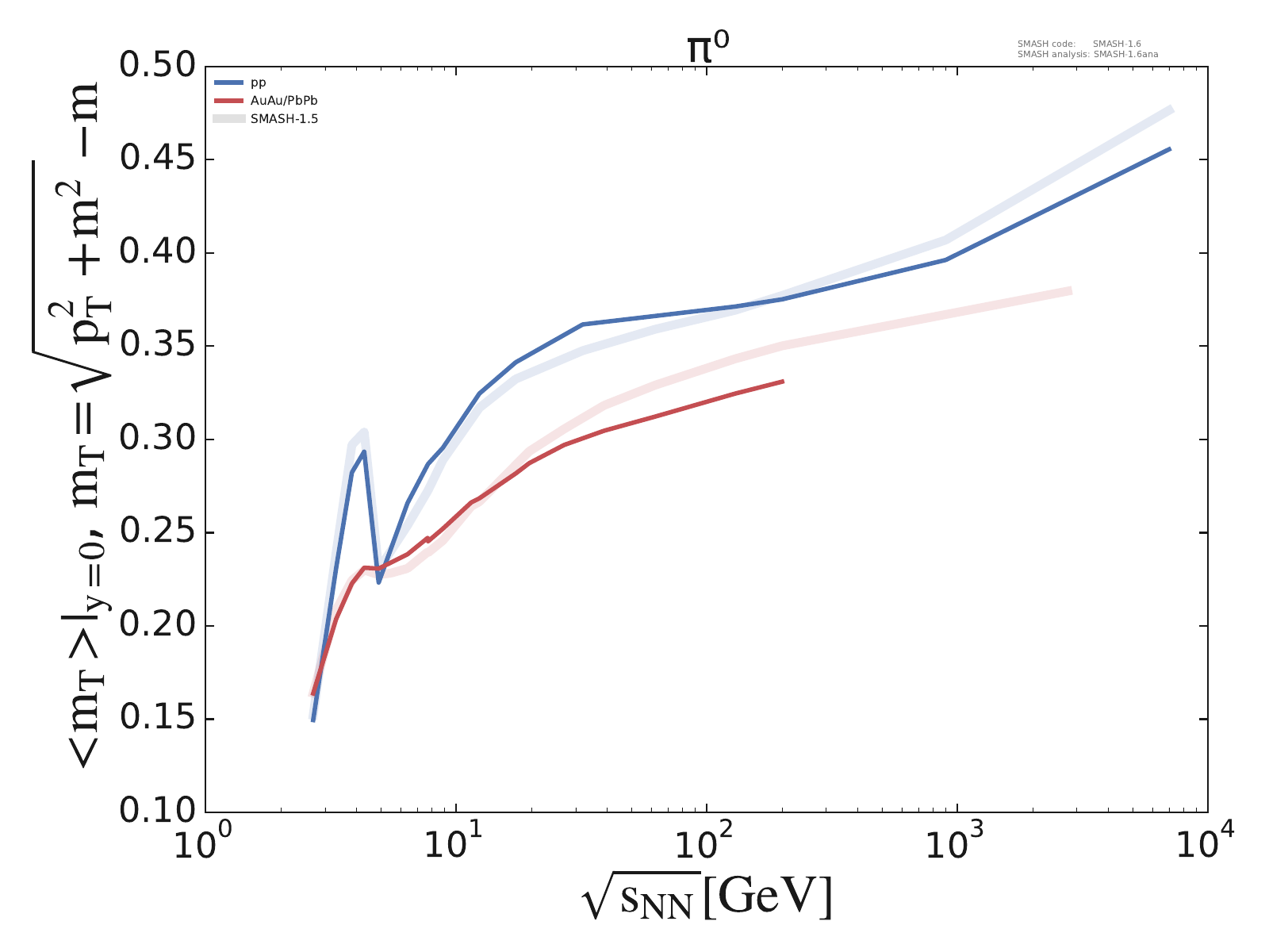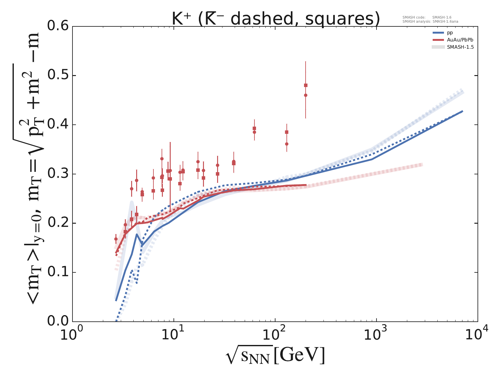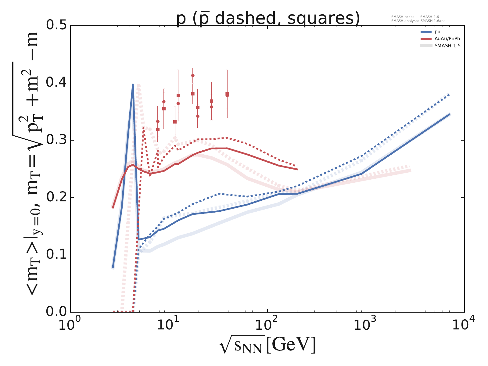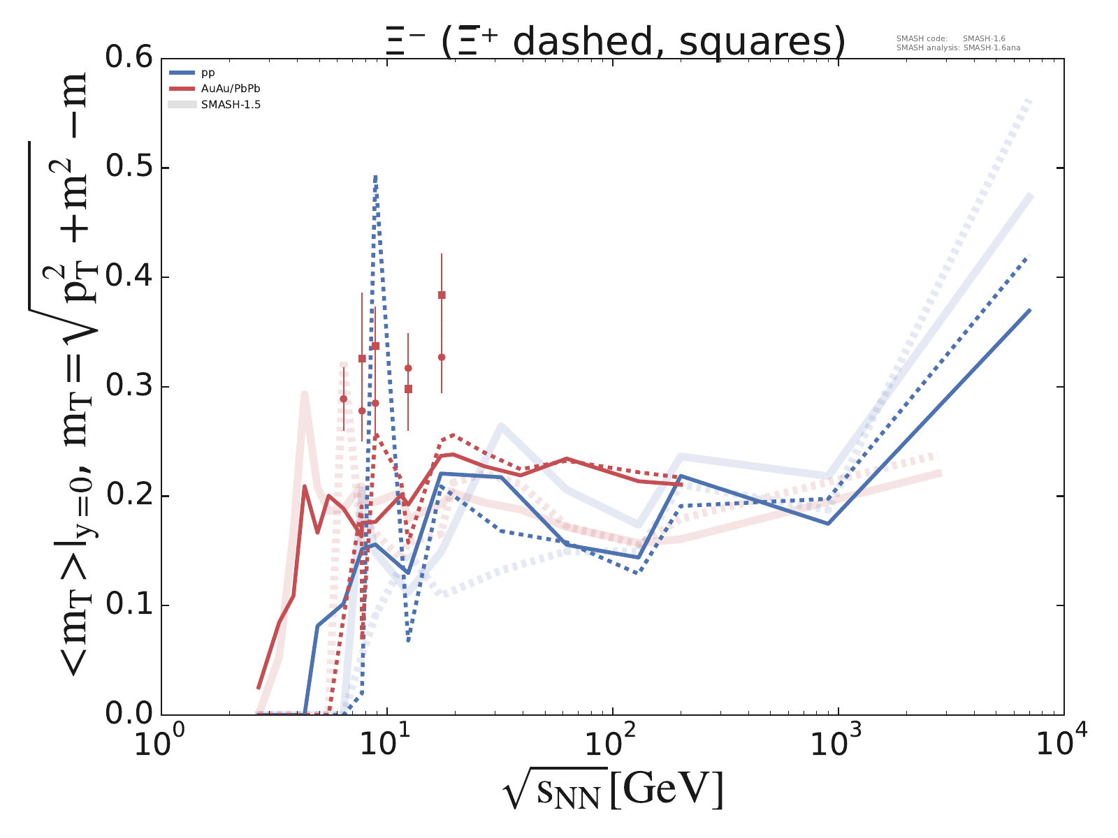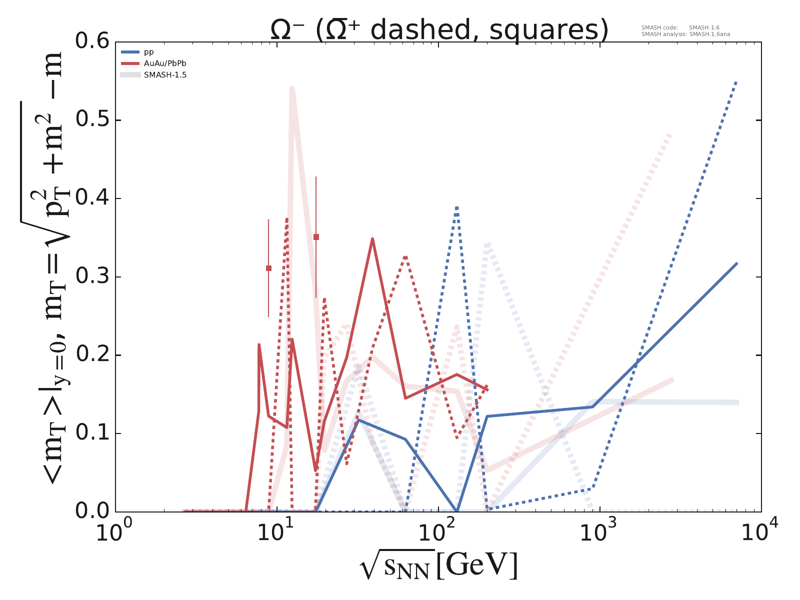 Mean transverse mass at midrapidity for π, K, P, Λ, Ξ and Ω multiplets as a function of center-of-mass energy in pp and AuAu/PbPb collisions.