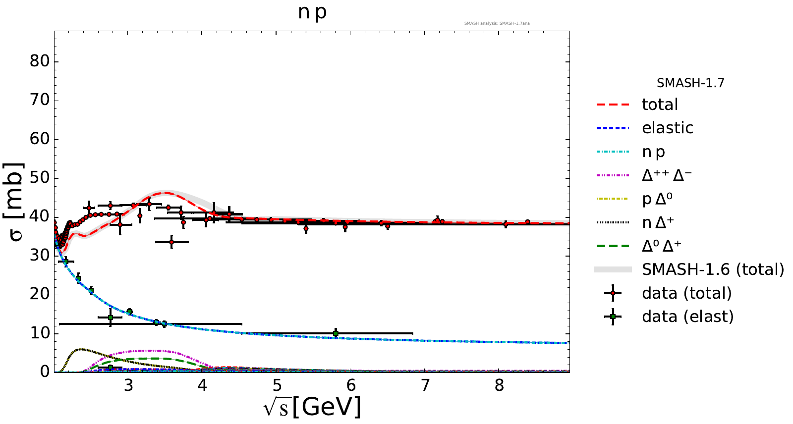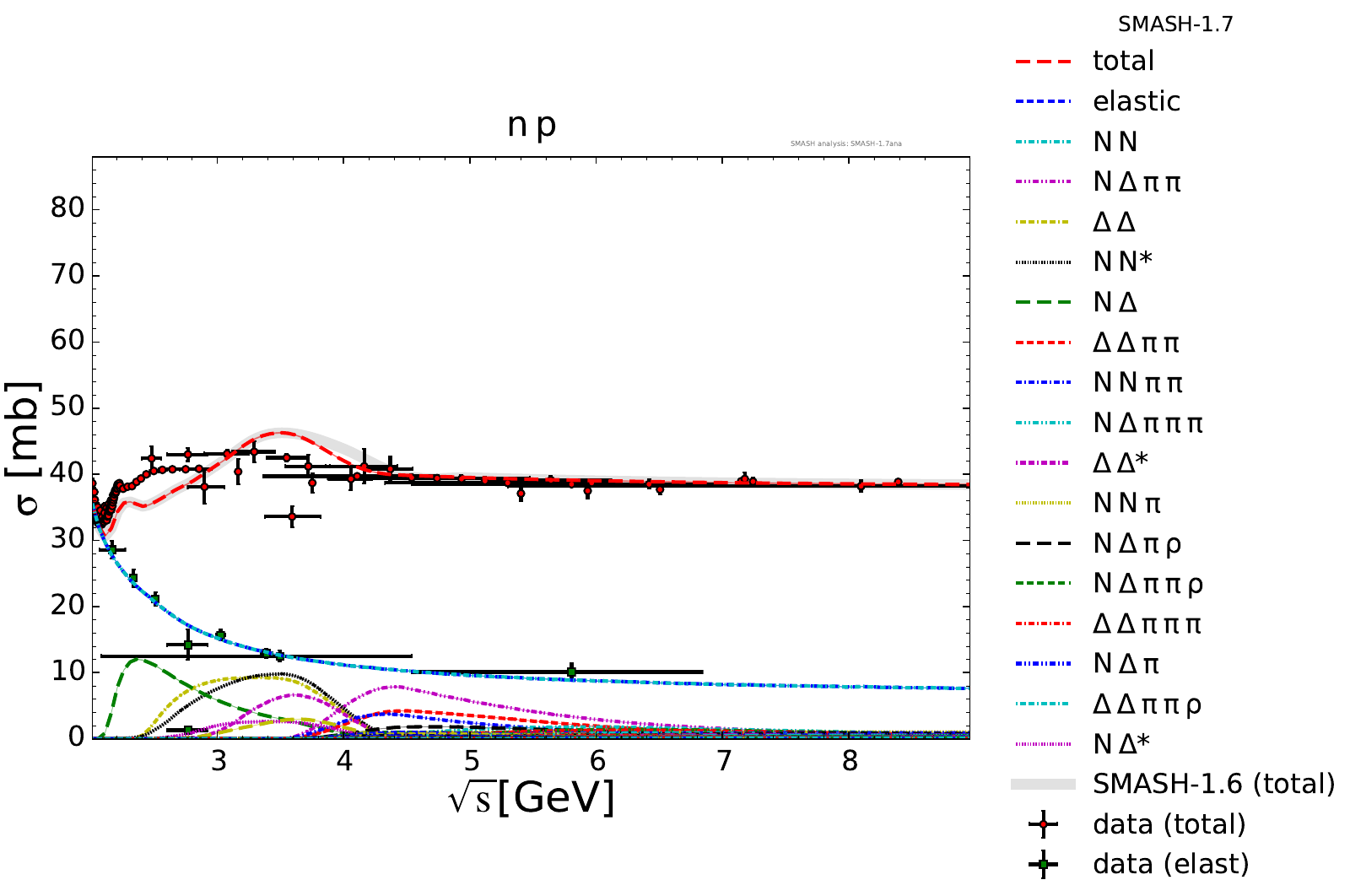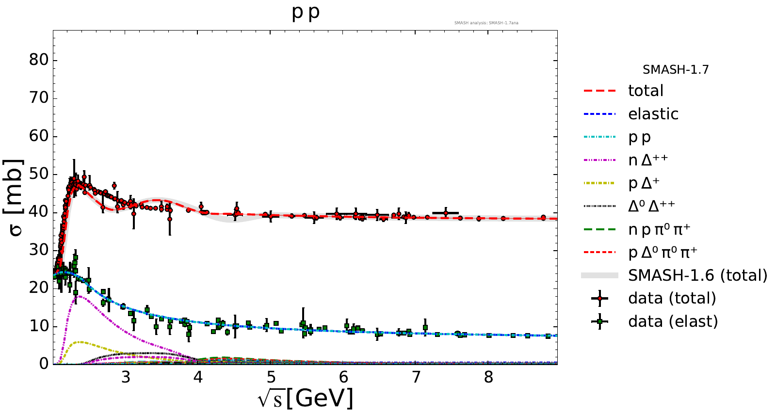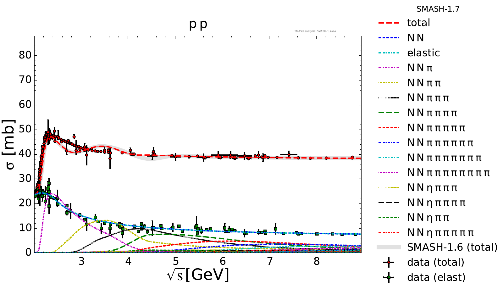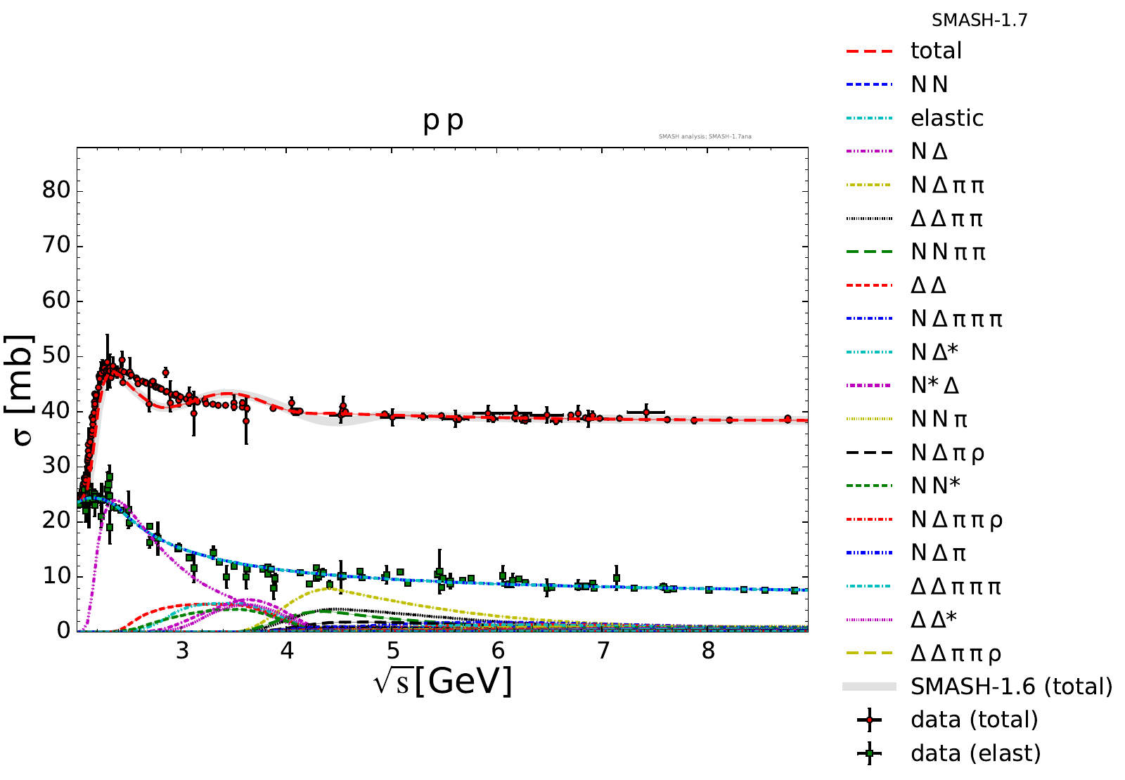 Collection of cross sections for different elementary scattering processes. Inclusive and exclusive cross sections are presented. Note: The transition region from resonances to strings was modified between SMASH-1.6 (√sNN = 4 - 5 GeV) and SMASH-1.7 (√sNN = 3.5 - 4.5 GeV).