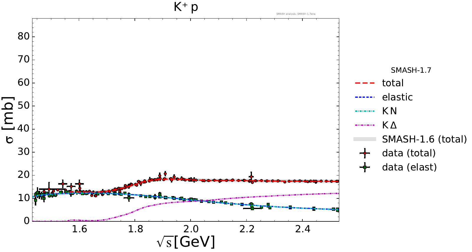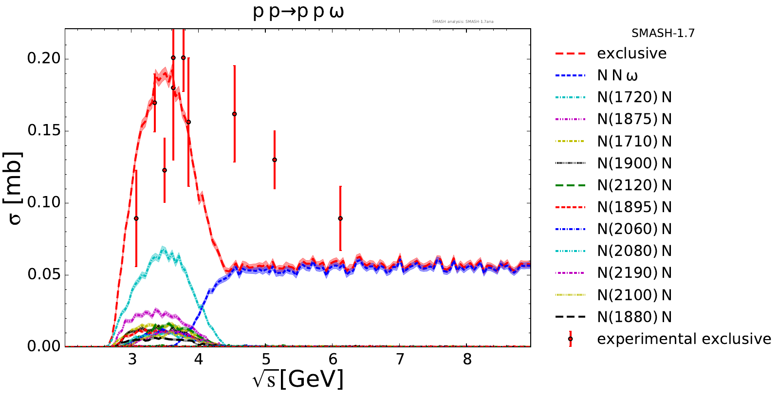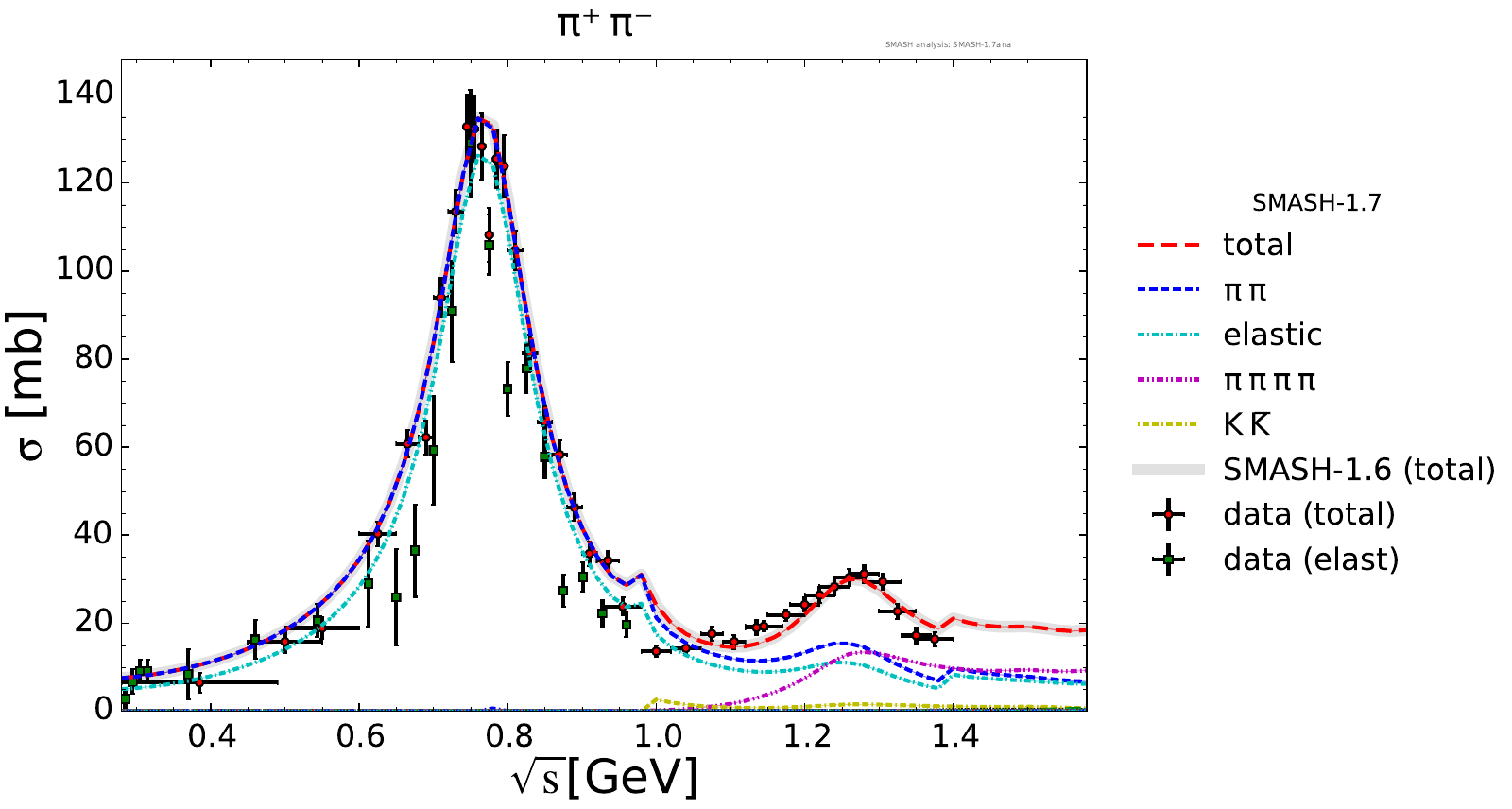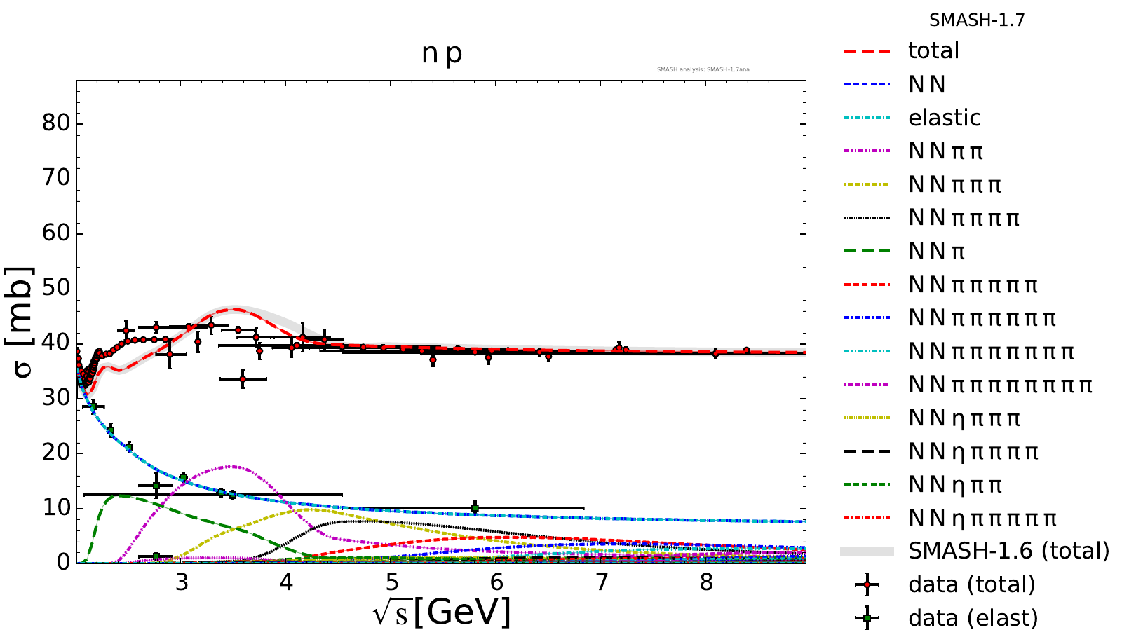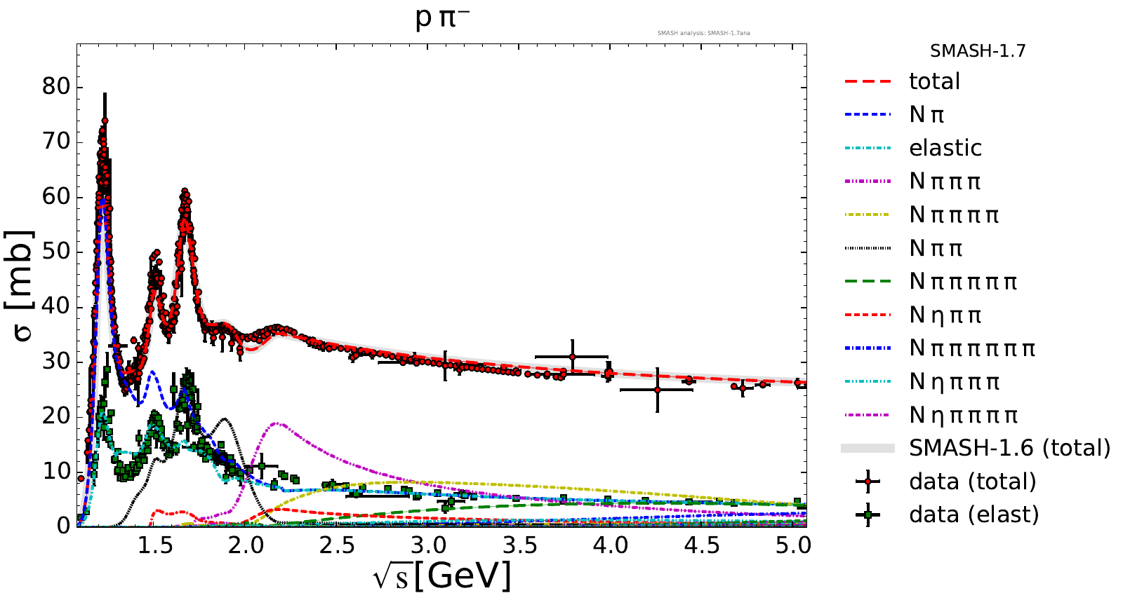 Collection of cross sections for different elementary scattering processes. Inclusive and exclusive cross sections are presented. Note: The transition region from resonances to strings was modified between SMASH-1.6 (√sNN = 4 - 5 GeV) and SMASH-1.7 (√sNN = 3.5 - 4.5 GeV).