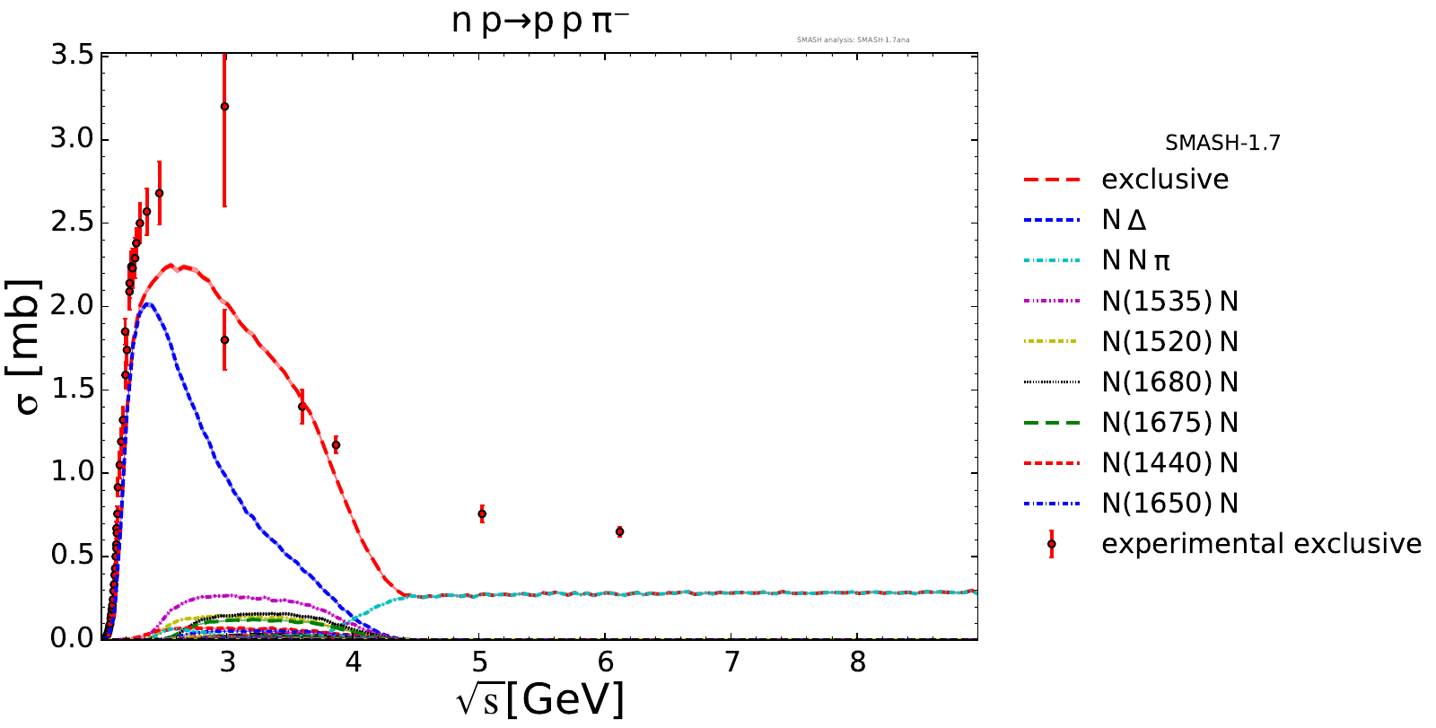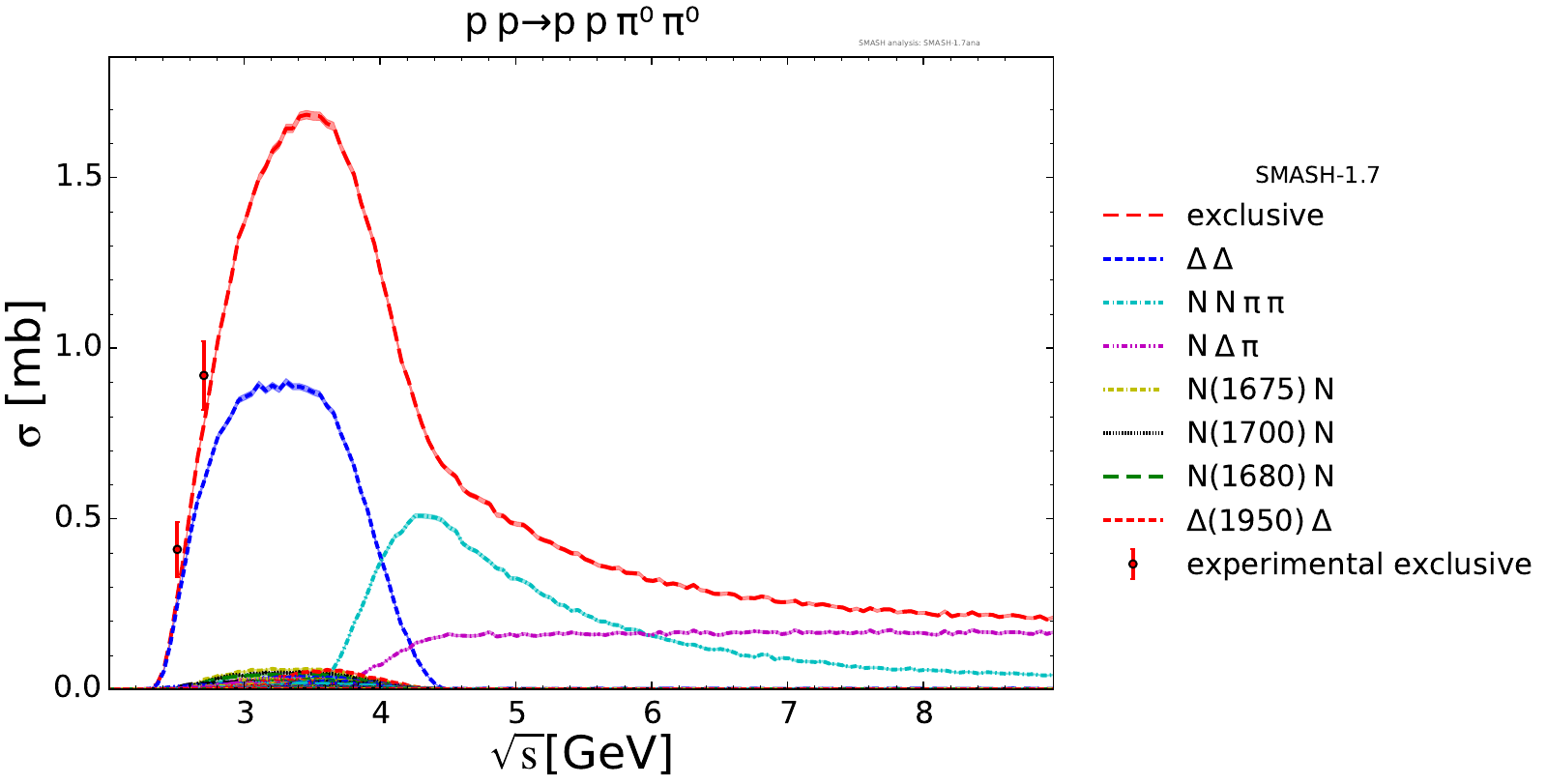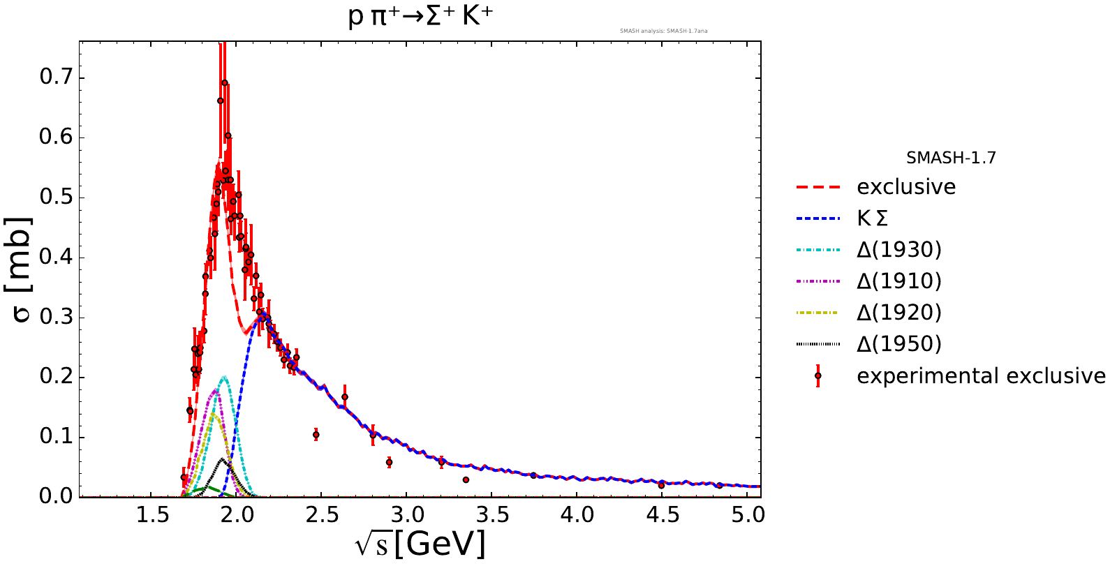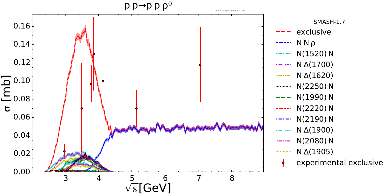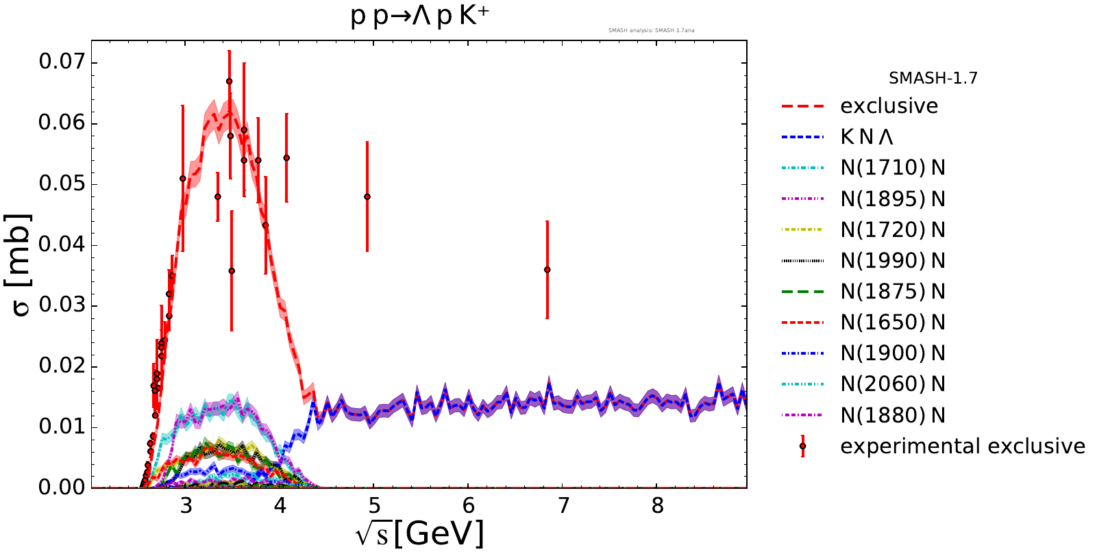 Collection of cross sections for different elementary scattering processes. Inclusive and exclusive cross sections are presented. Note: The transition region from resonances to strings was modified between SMASH-1.6 (√sNN = 4 - 5 GeV) and SMASH-1.7 (√sNN = 3.5 - 4.5 GeV).