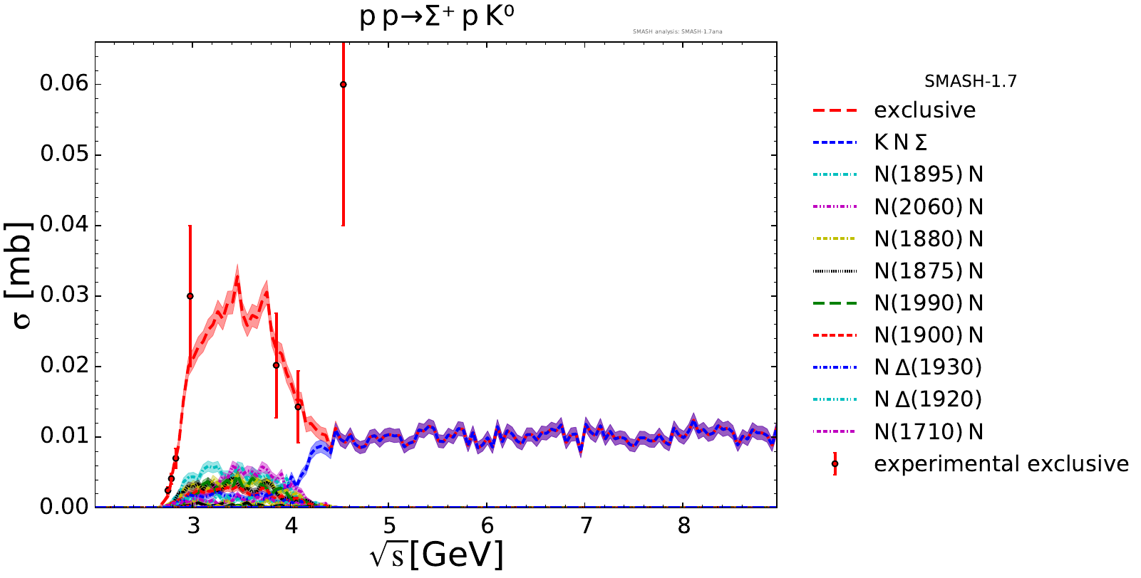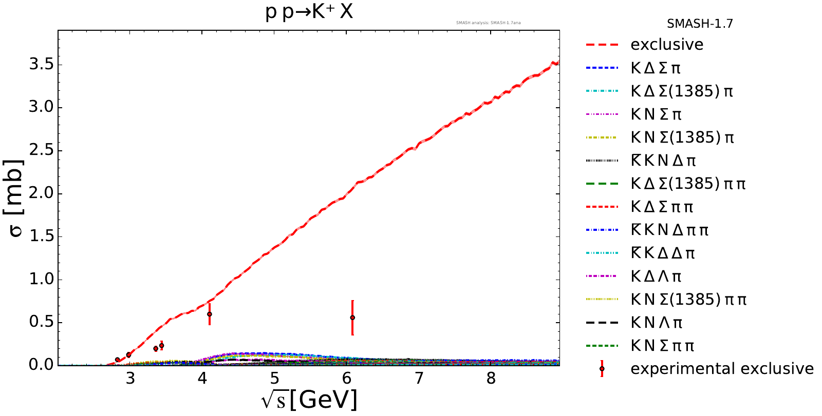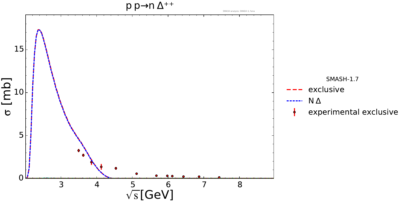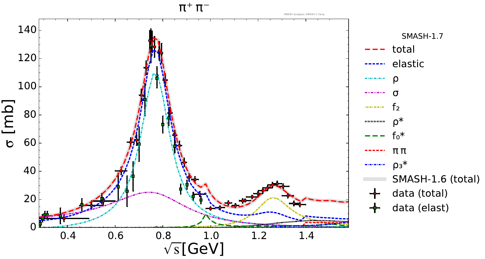 Collection of cross sections for different elementary scattering processes. Inclusive and exclusive cross sections are presented. Note: The transition region from resonances to strings was modified between SMASH-1.6 (√sNN = 4 - 5 GeV) and SMASH-1.7 (√sNN = 3.5 - 4.5 GeV).