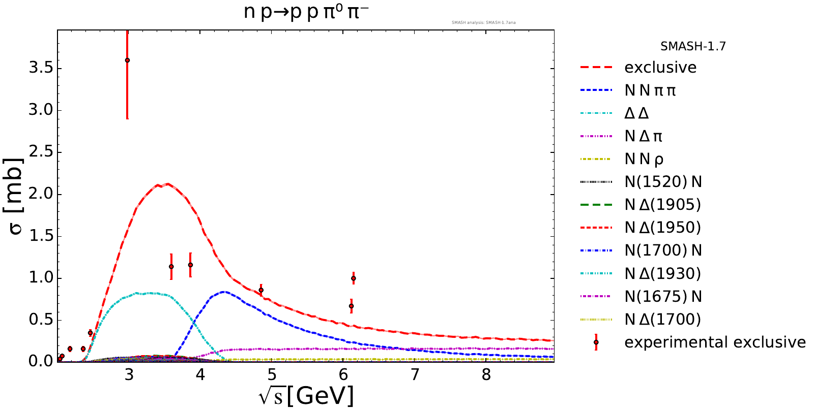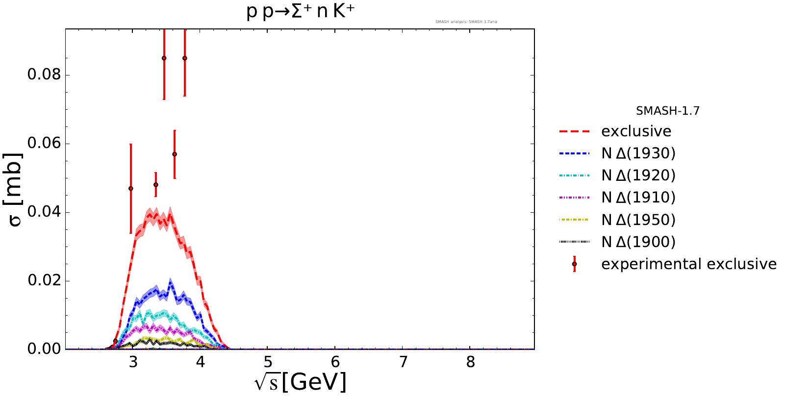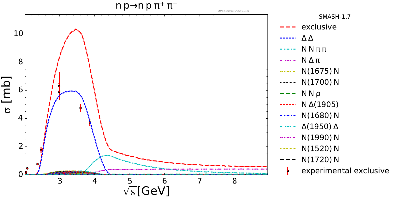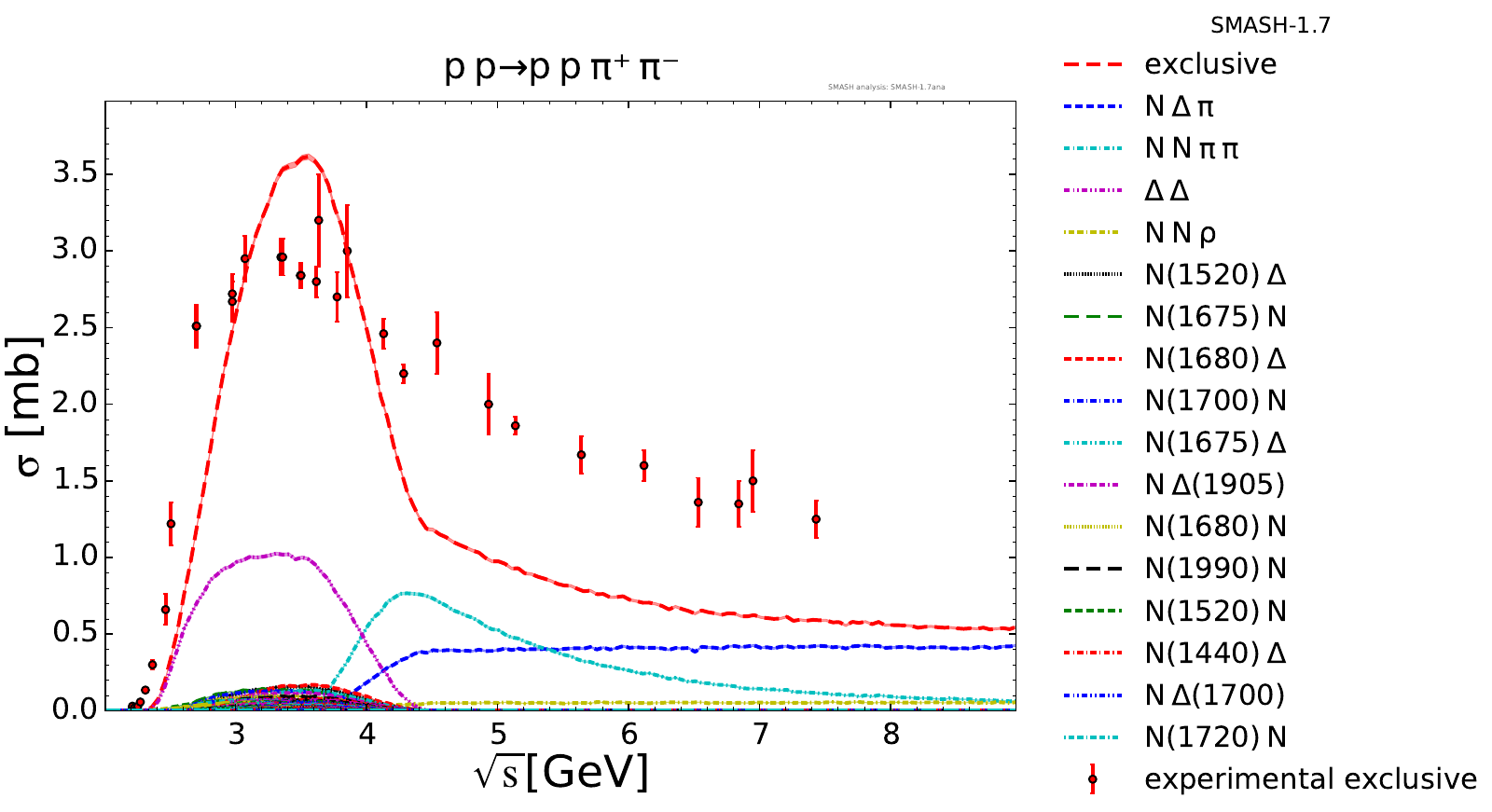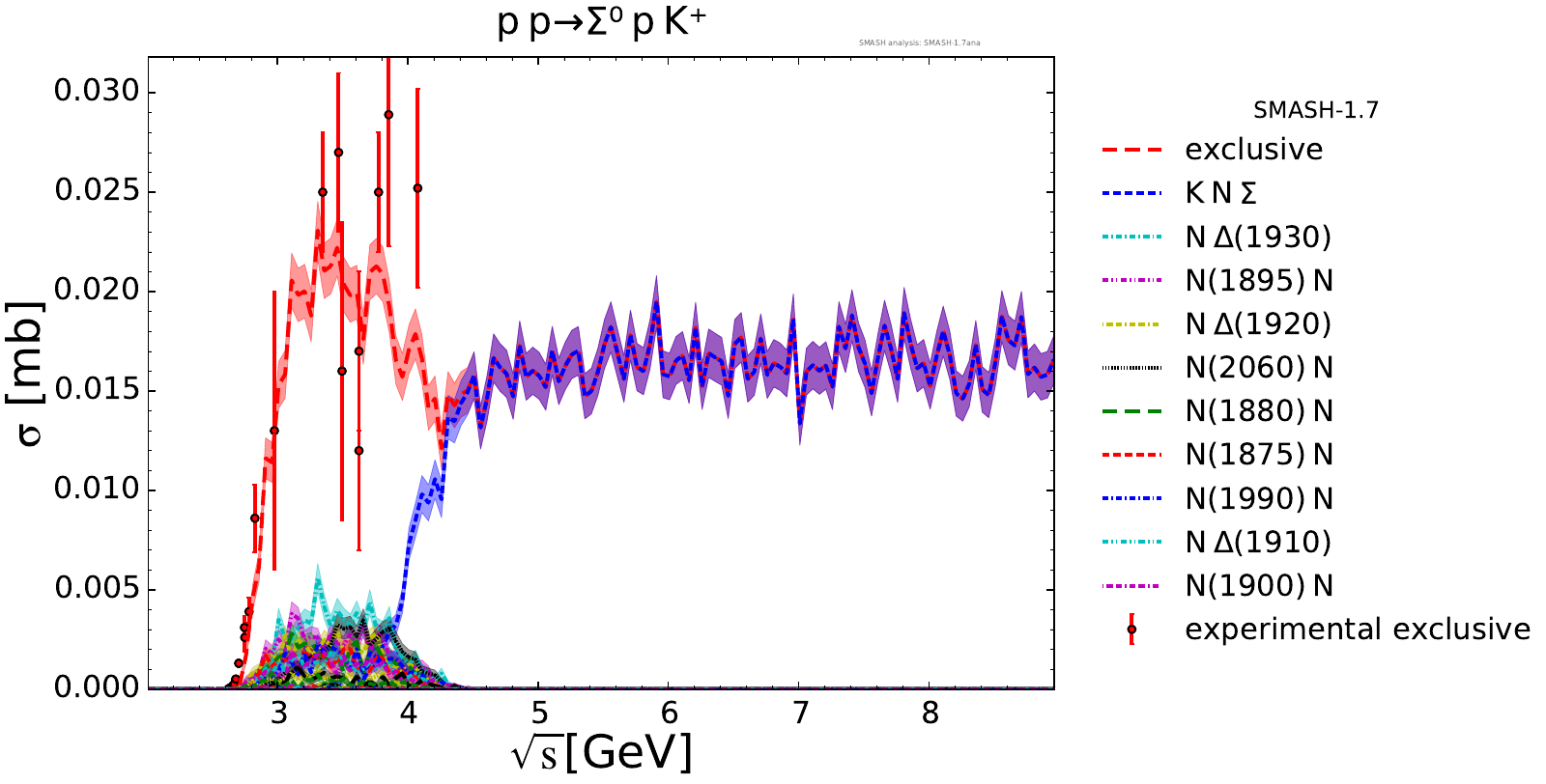 Collection of cross sections for different elementary scattering processes. Inclusive and exclusive cross sections are presented. Note: The transition region from resonances to strings was modified between SMASH-1.6 (√sNN = 4 - 5 GeV) and SMASH-1.7 (√sNN = 3.5 - 4.5 GeV).
