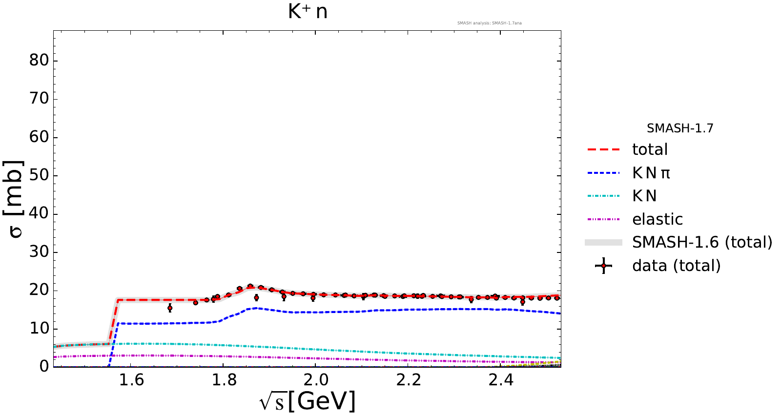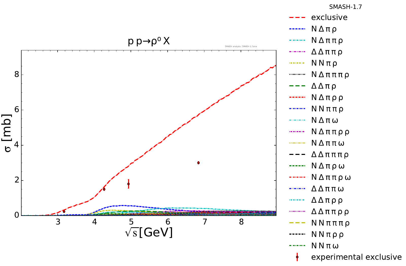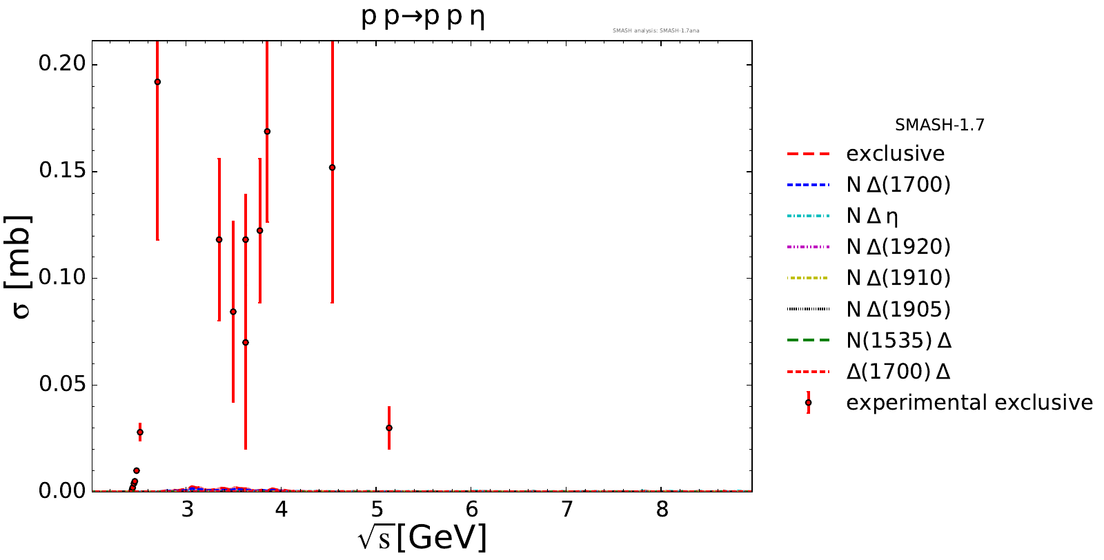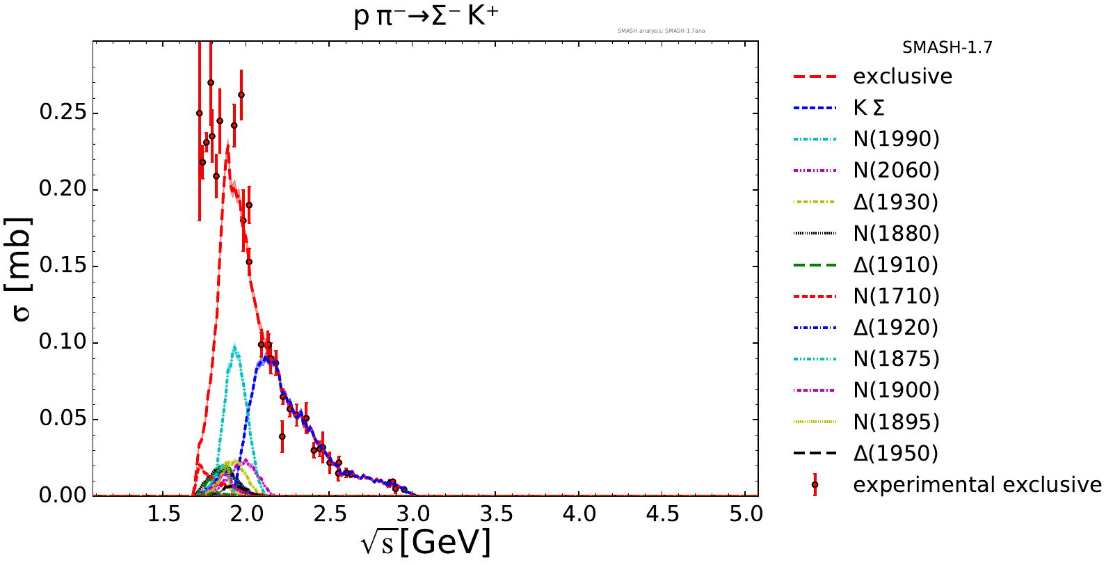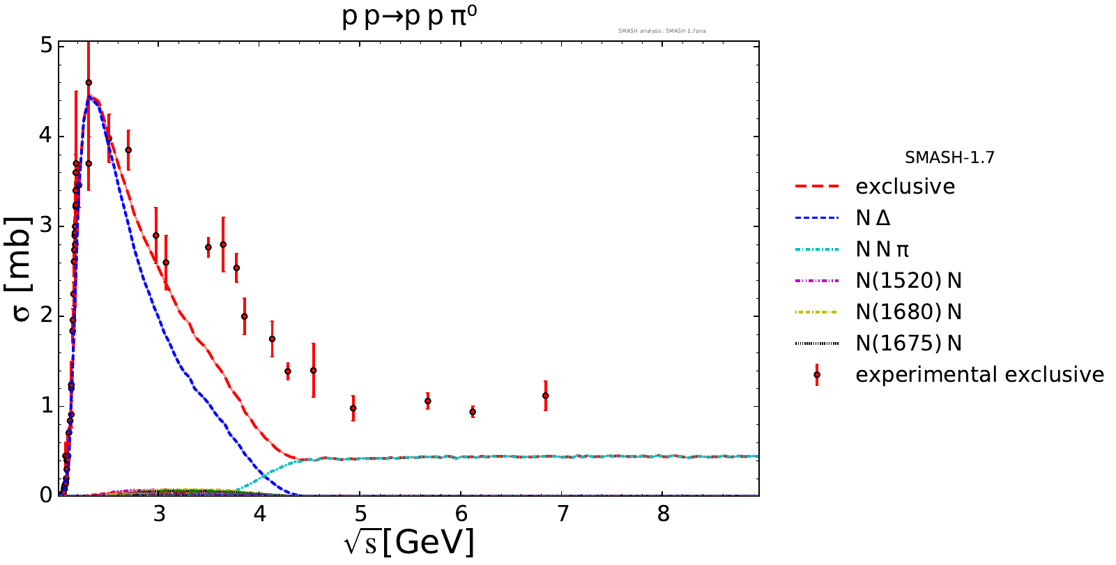 Collection of cross sections for different elementary scattering processes. Inclusive and exclusive cross sections are presented. Note: The transition region from resonances to strings was modified between SMASH-1.6 (√sNN = 4 - 5 GeV) and SMASH-1.7 (√sNN = 3.5 - 4.5 GeV).