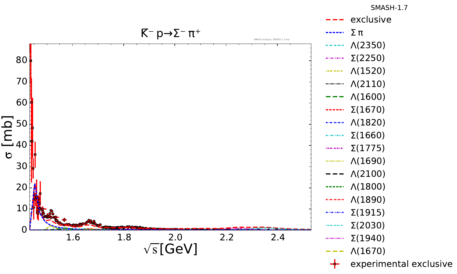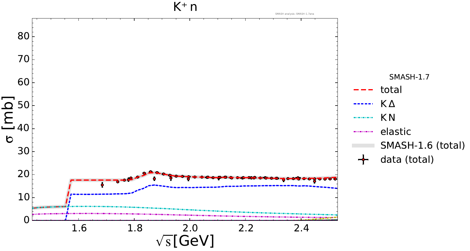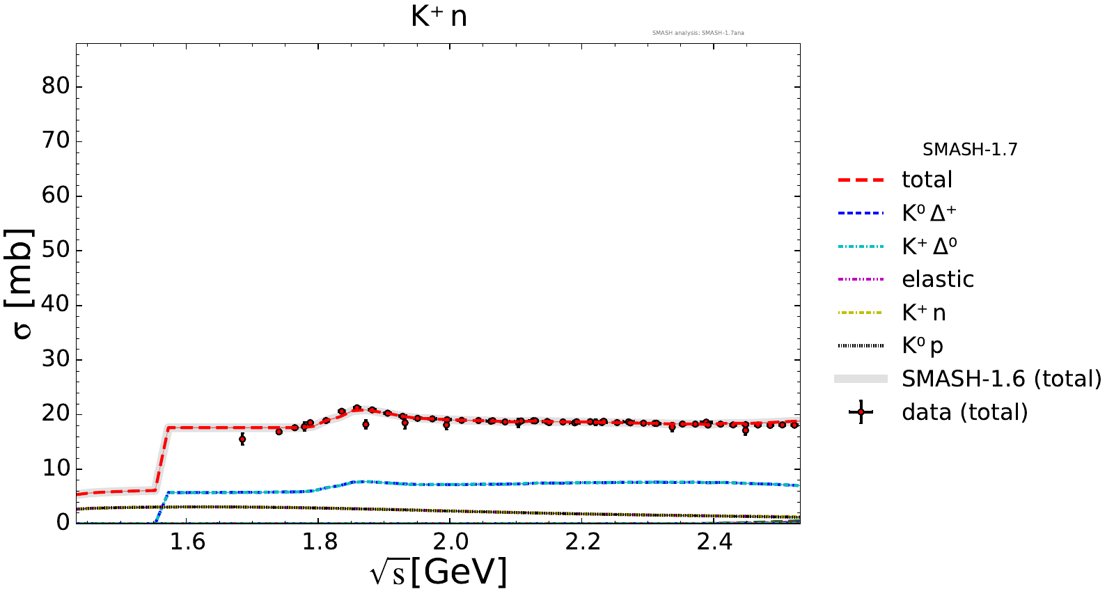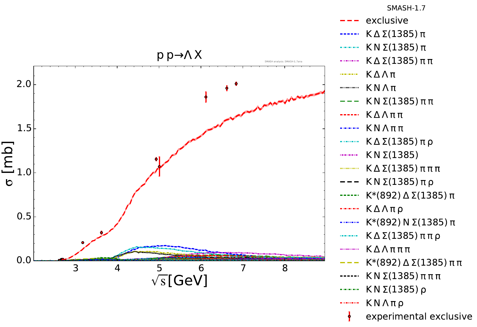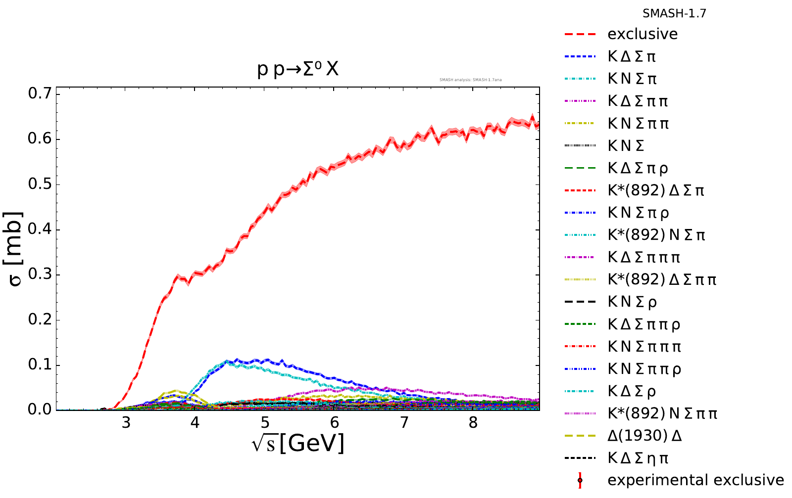 Collection of cross sections for different elementary scattering processes. Inclusive and exclusive cross sections are presented. Note: The transition region from resonances to strings was modified between SMASH-1.6 (√sNN = 4 - 5 GeV) and SMASH-1.7 (√sNN = 3.5 - 4.5 GeV).