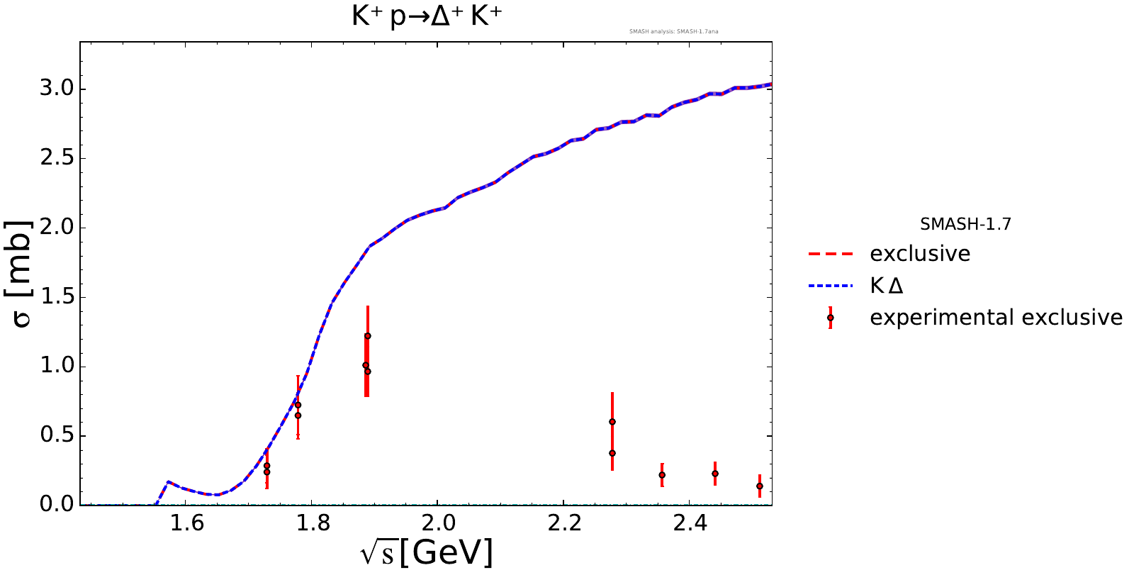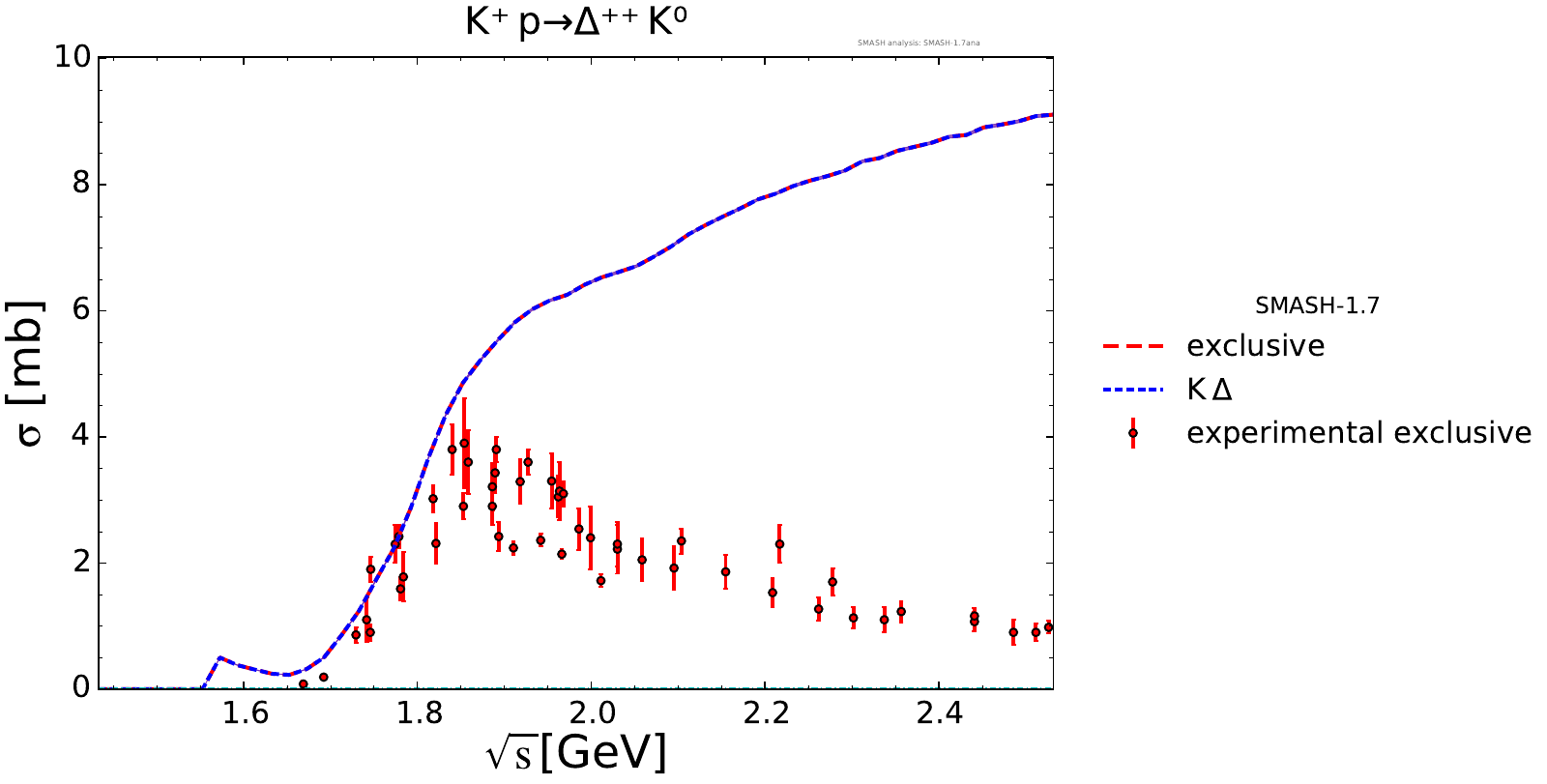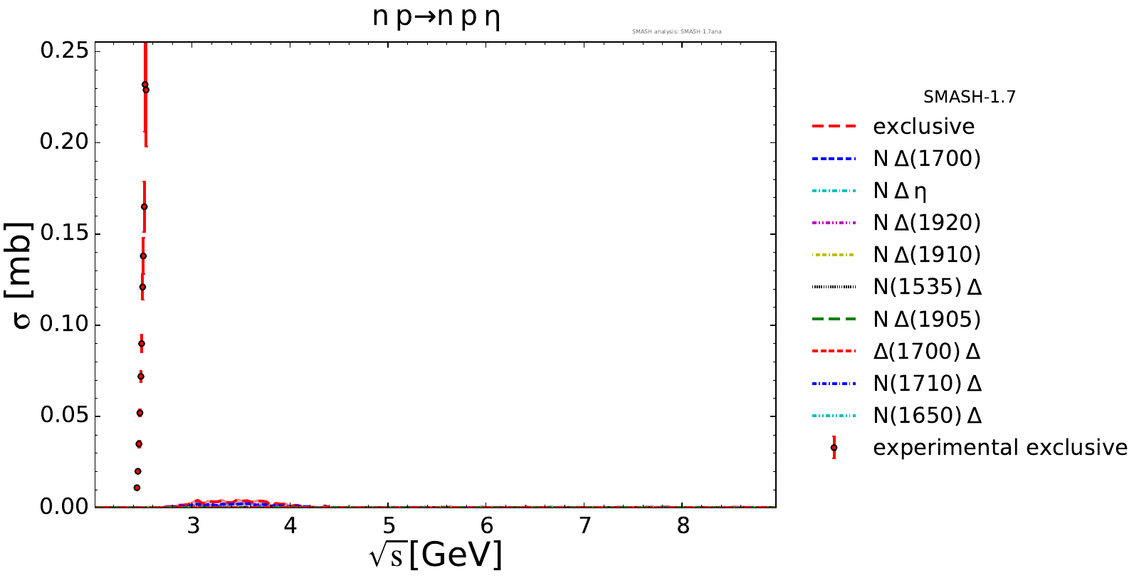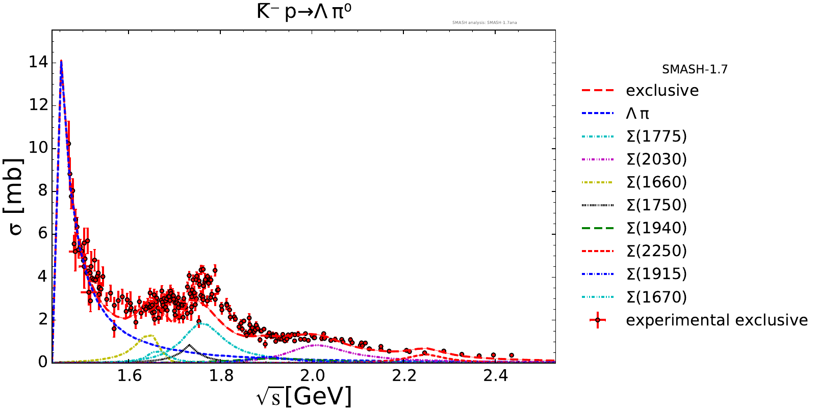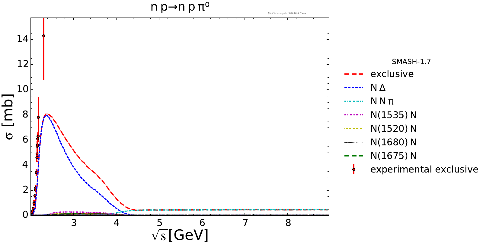 Collection of cross sections for different elementary scattering processes. Inclusive and exclusive cross sections are presented. Note: The transition region from resonances to strings was modified between SMASH-1.6 (√sNN = 4 - 5 GeV) and SMASH-1.7 (√sNN = 3.5 - 4.5 GeV).