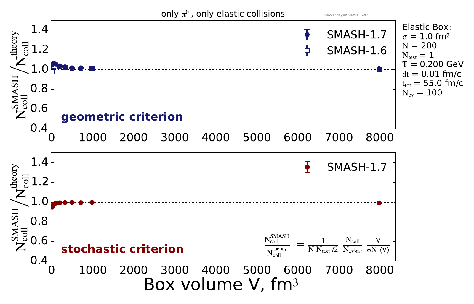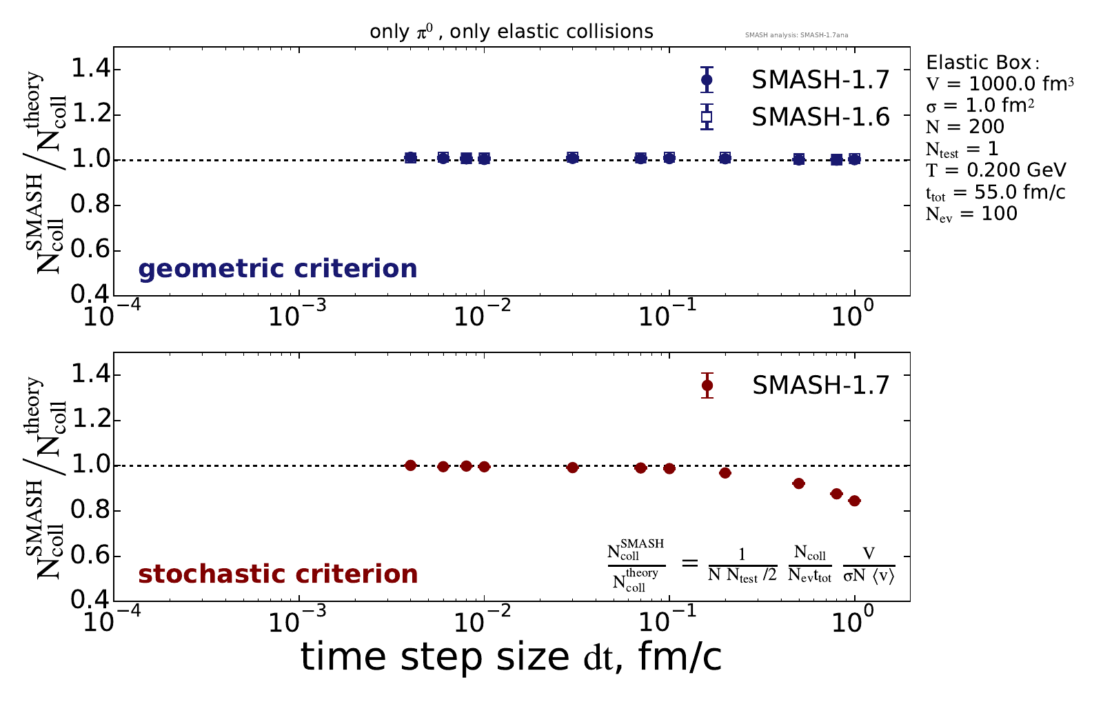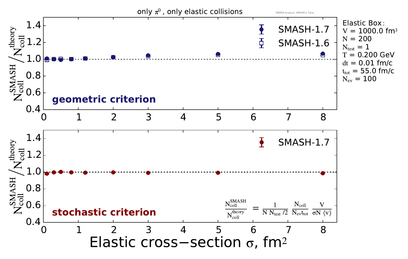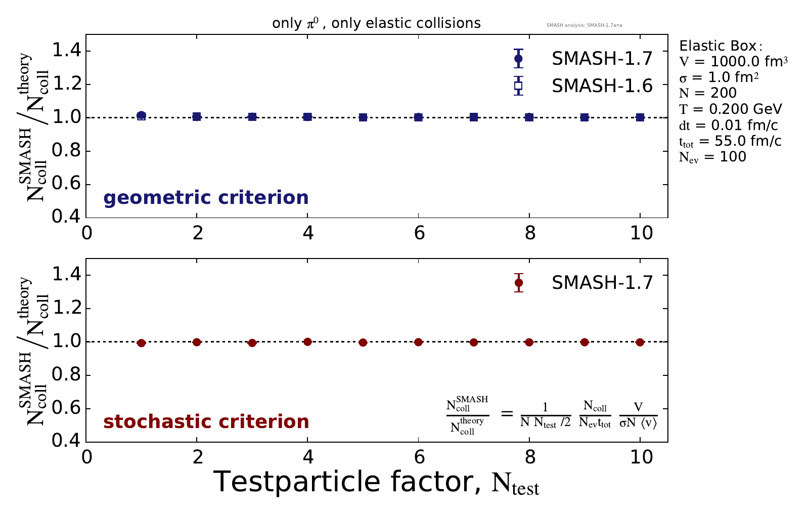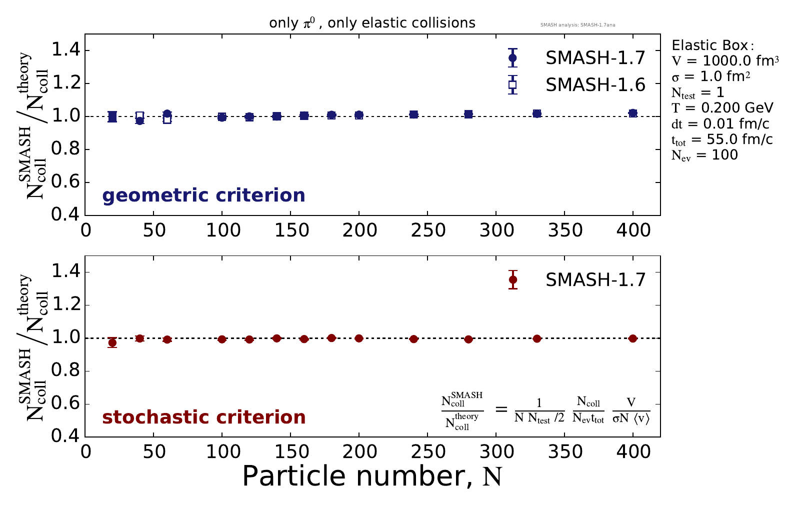 Analysis of scattering rates in infinite matter simulations with only elastic collisions. Sensitivity of scattering rates to variation of different setup parameters is investigated. The number of collisions in SMASH is, in the following plots, normalized to the theoretically expected number of collisions of a dilute gas: Nevents t σ N2 Ntest <vrel> / (2 V) We therefore expect this value at ≈ 1.0. Note: The transition region from resonances to strings was modified between SMASH-1.6 (√sNN = 4 - 5 GeV) and SMASH-1.7 (√sNN = 3.5 - 4.5 GeV).