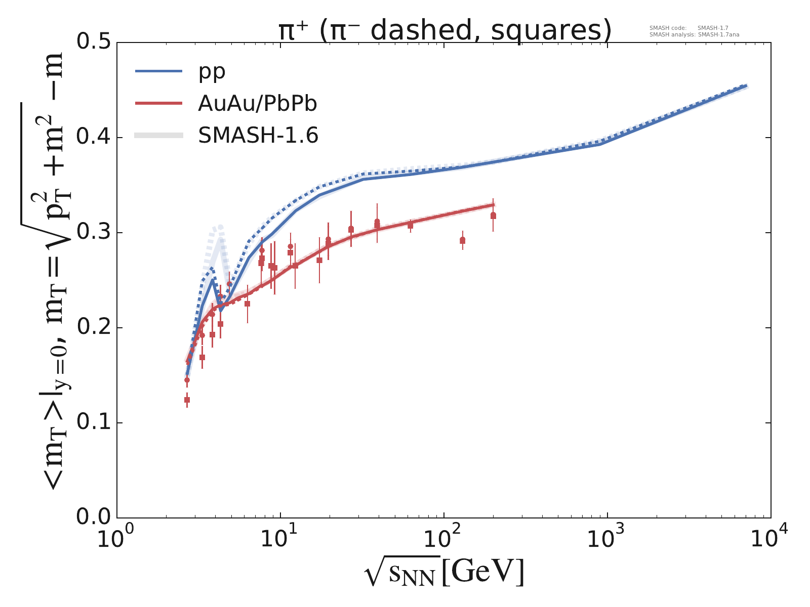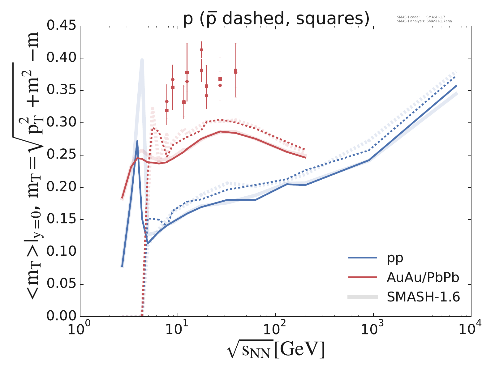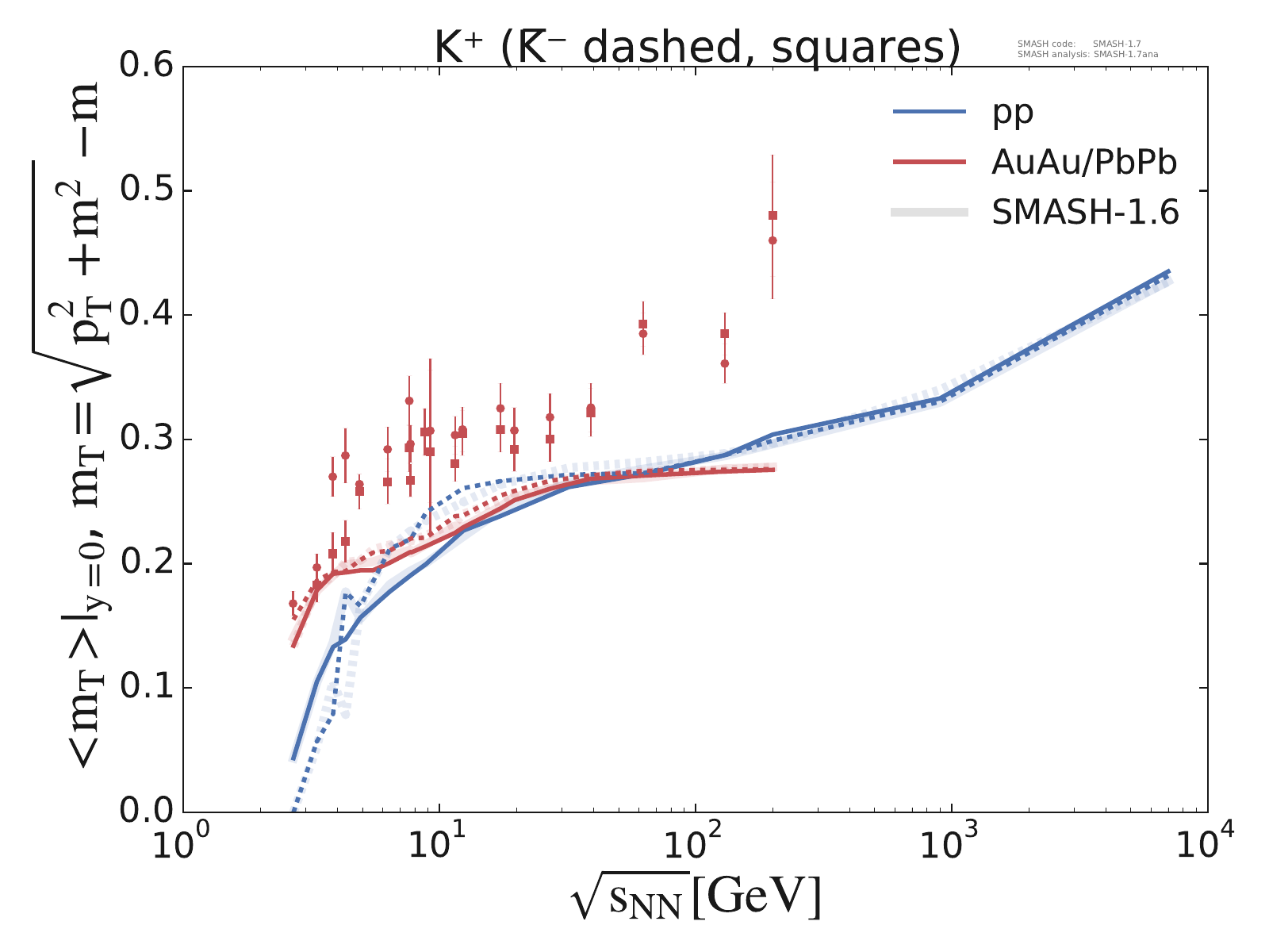 Note: Peak in the region of √sNN ≈ 3 - 5 GeV is due to uncertainties in the transition from resonances to strings. Note: Deviations for collision energies between 3 and 5 GeV are expected, as the transition region from resonances to strings was modified between SMASH-1.6 (√sNN = 4 - 5 GeV) and SMASH-1.7 (√sNN = 3.5 - 4.5 GeV).