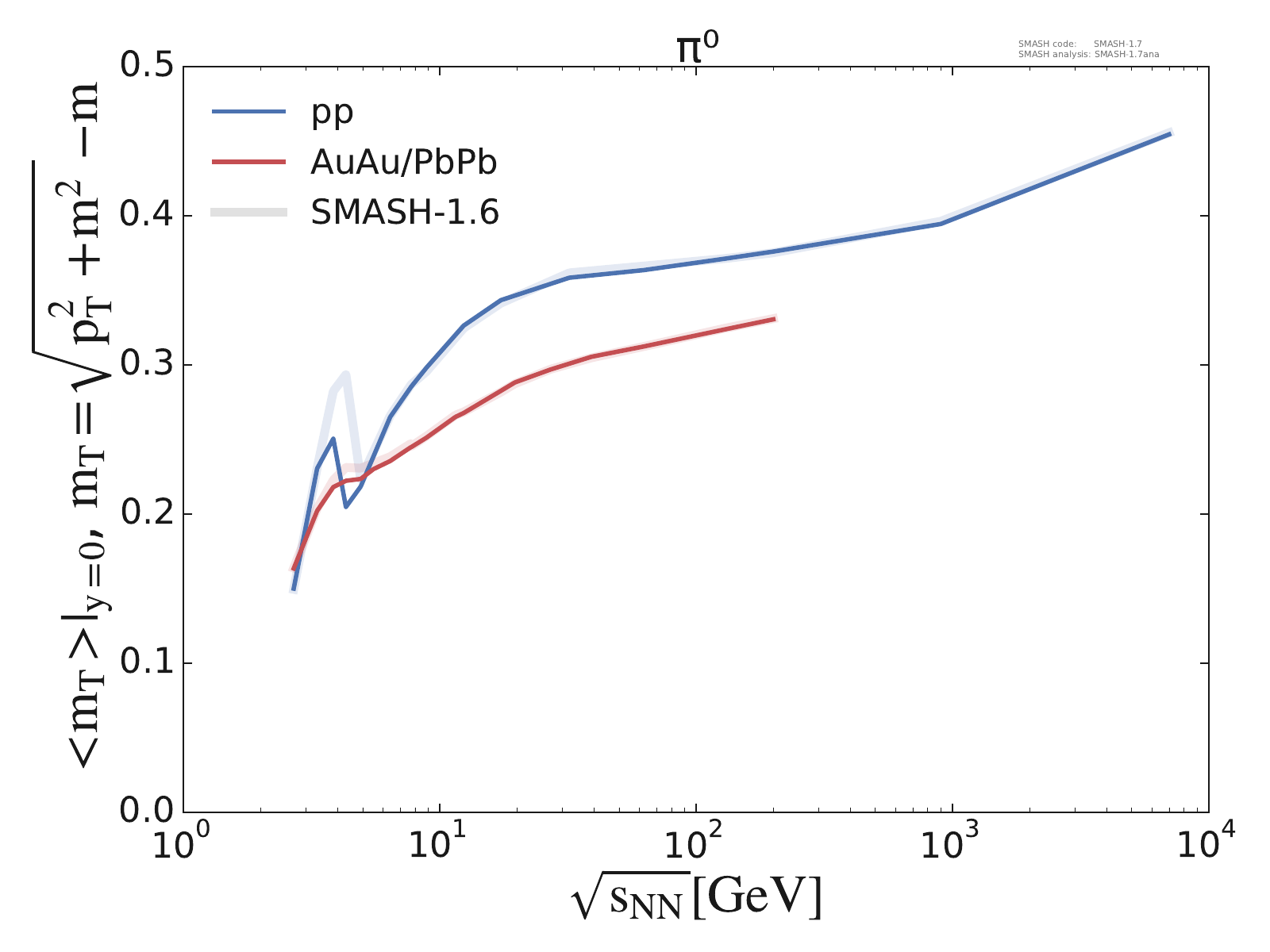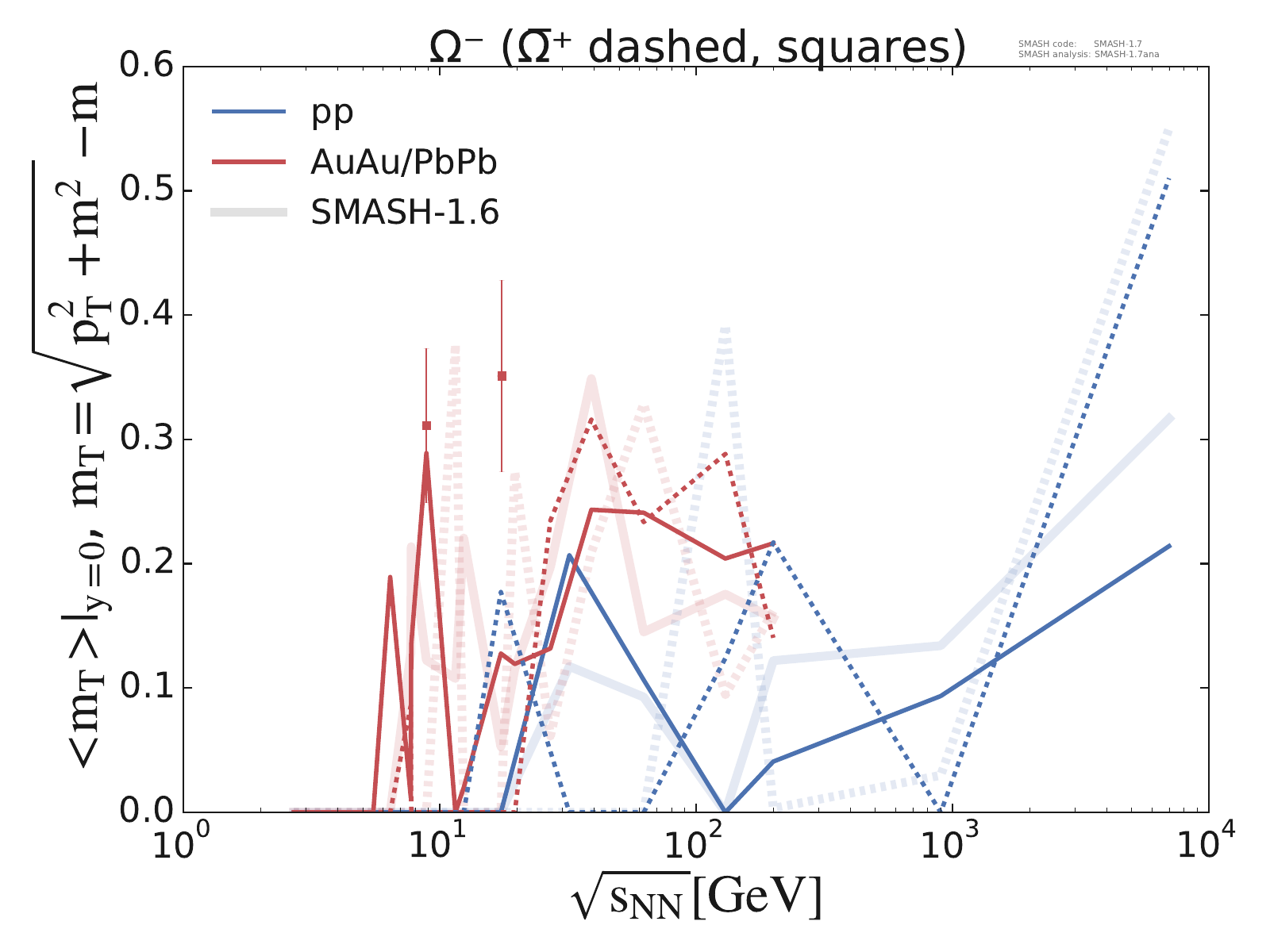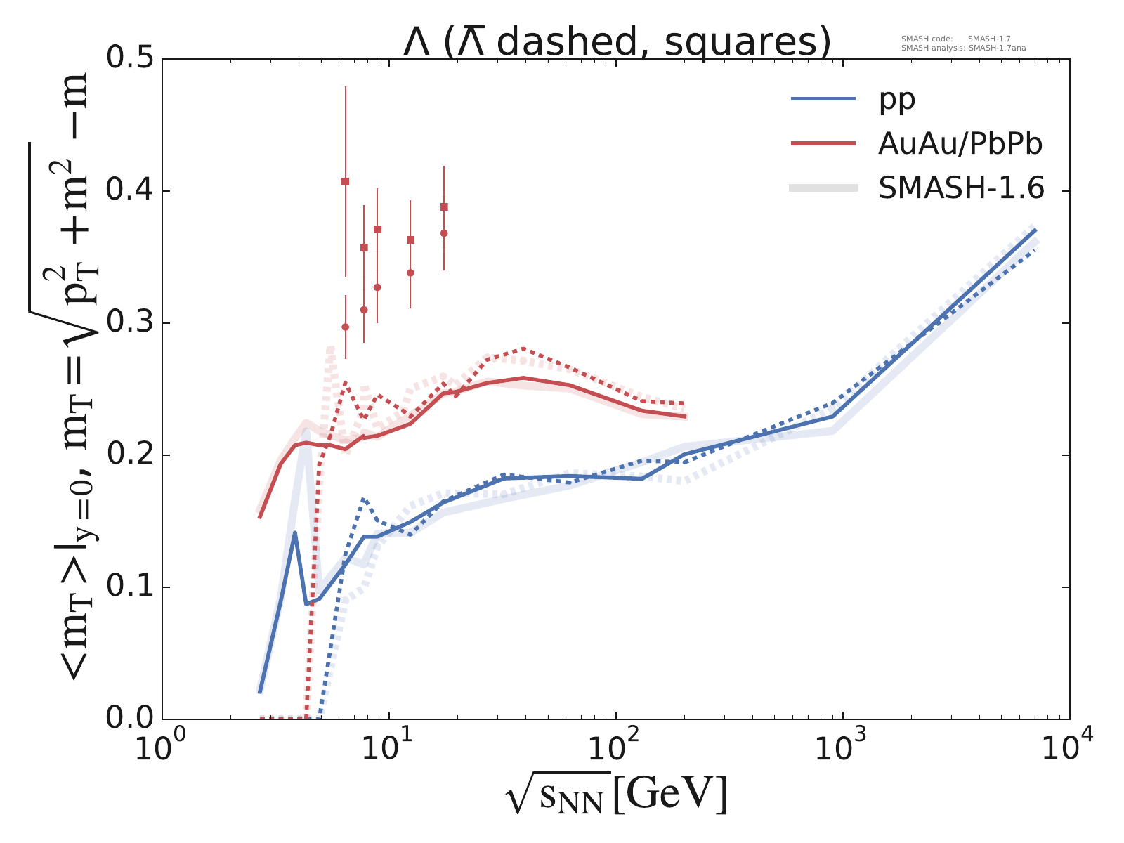 Note: Peak in the region of √sNN ≈ 3 - 5 GeV is due to uncertainties in the transition from resonances to strings. Note: Deviations for collision energies between 3 and 5 GeV are expected, as the transition region from resonances to strings was modified between SMASH-1.6 (√sNN = 4 - 5 GeV) and SMASH-1.7 (√sNN = 3.5 - 4.5 GeV).