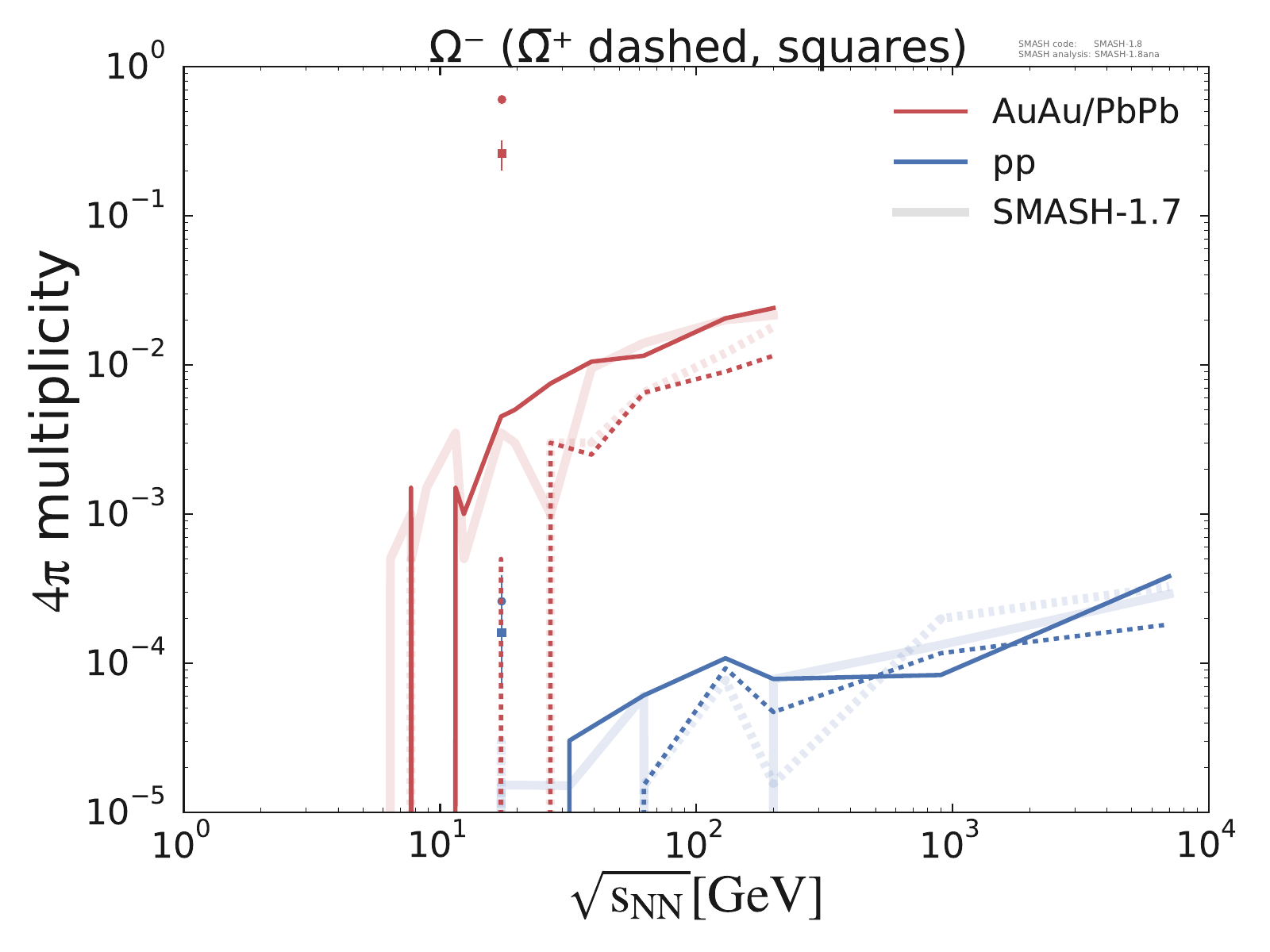Total particle multiplicities for π, K, P, Λ, Ξ and Ω multiplets as a function of center-of-mass energy in pp and AuAu/PbPb collisions.