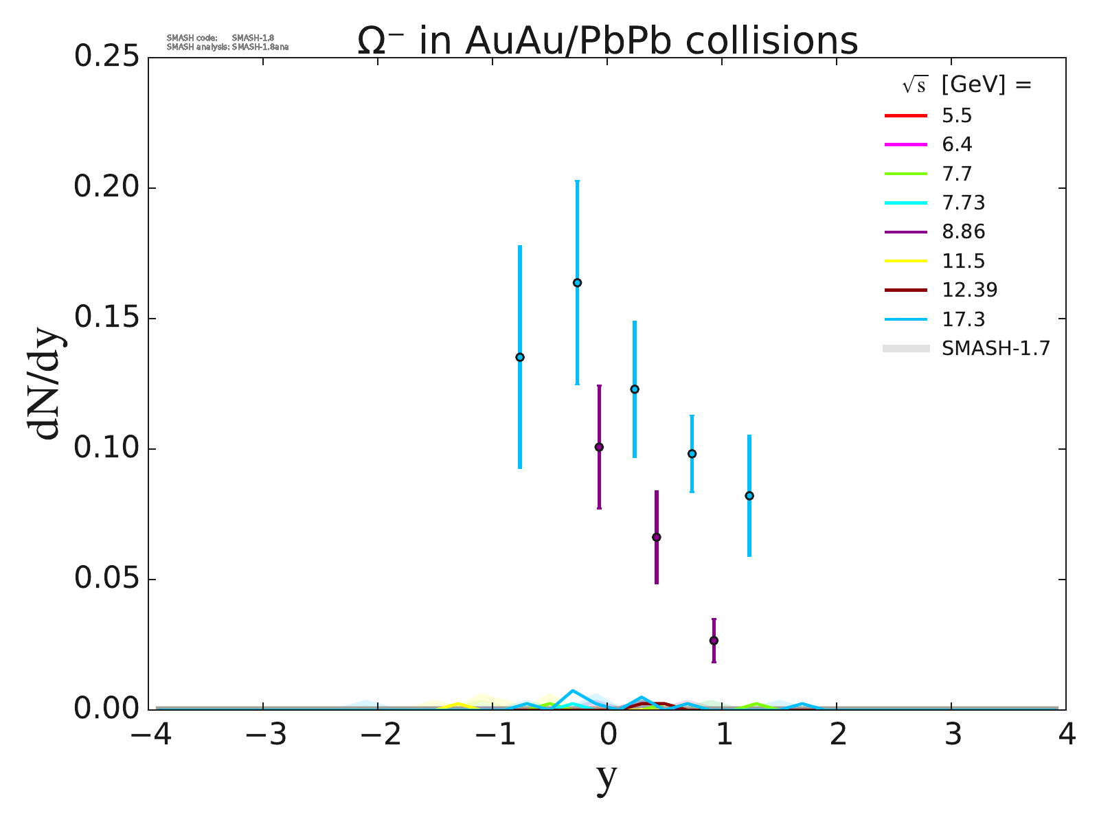 Rapidity spectra for π, K, P, Λ, Ξ and Ω multiplets at AGS, SPS and RHIC/LHC energies in pp and AuAu/PbPb collisions.