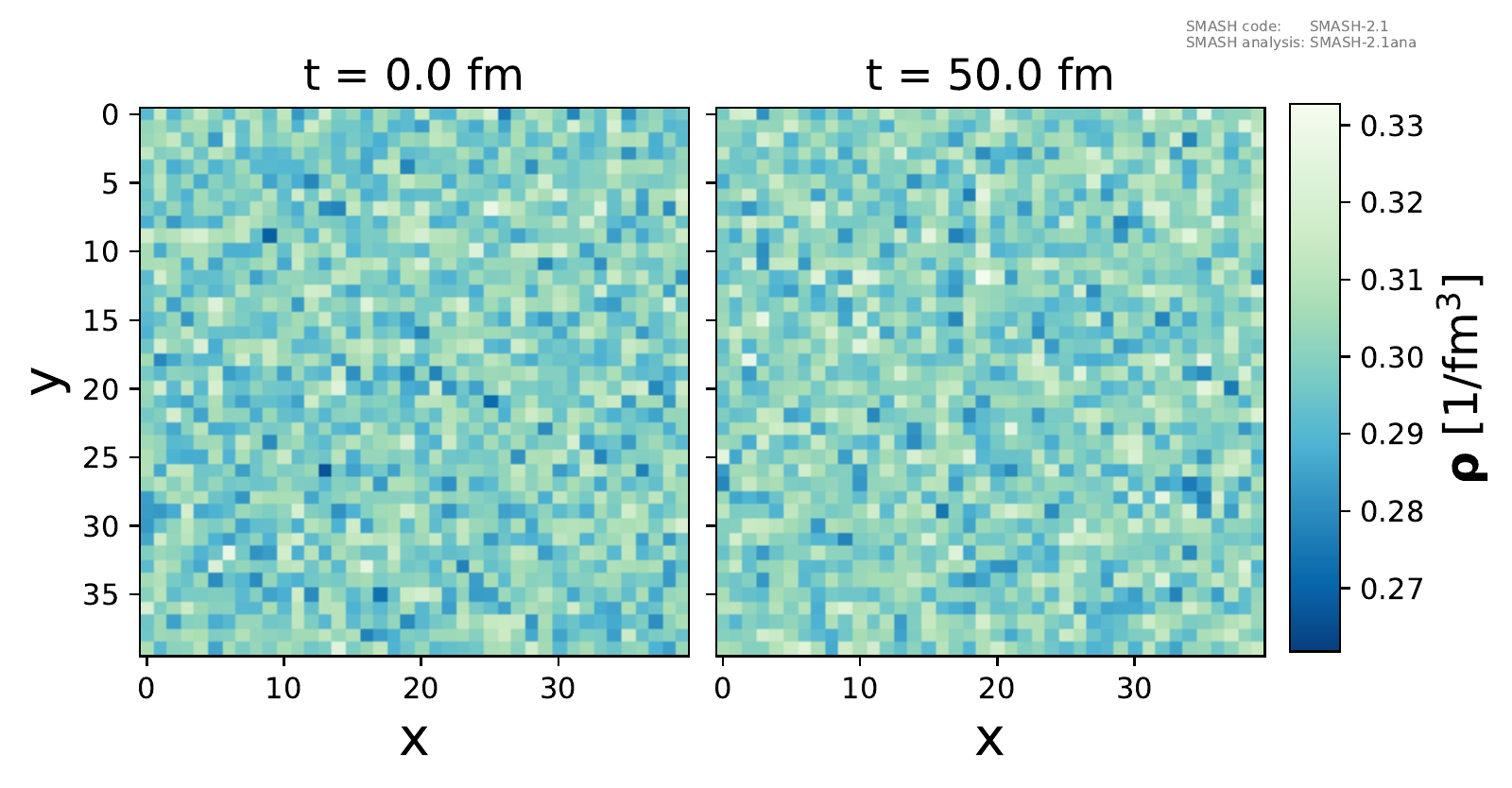 Time evolution of the baryon density in the central cell of a Au + Au collision and of the particle density in infinite matter simulations (box) for different degrees of freedom.