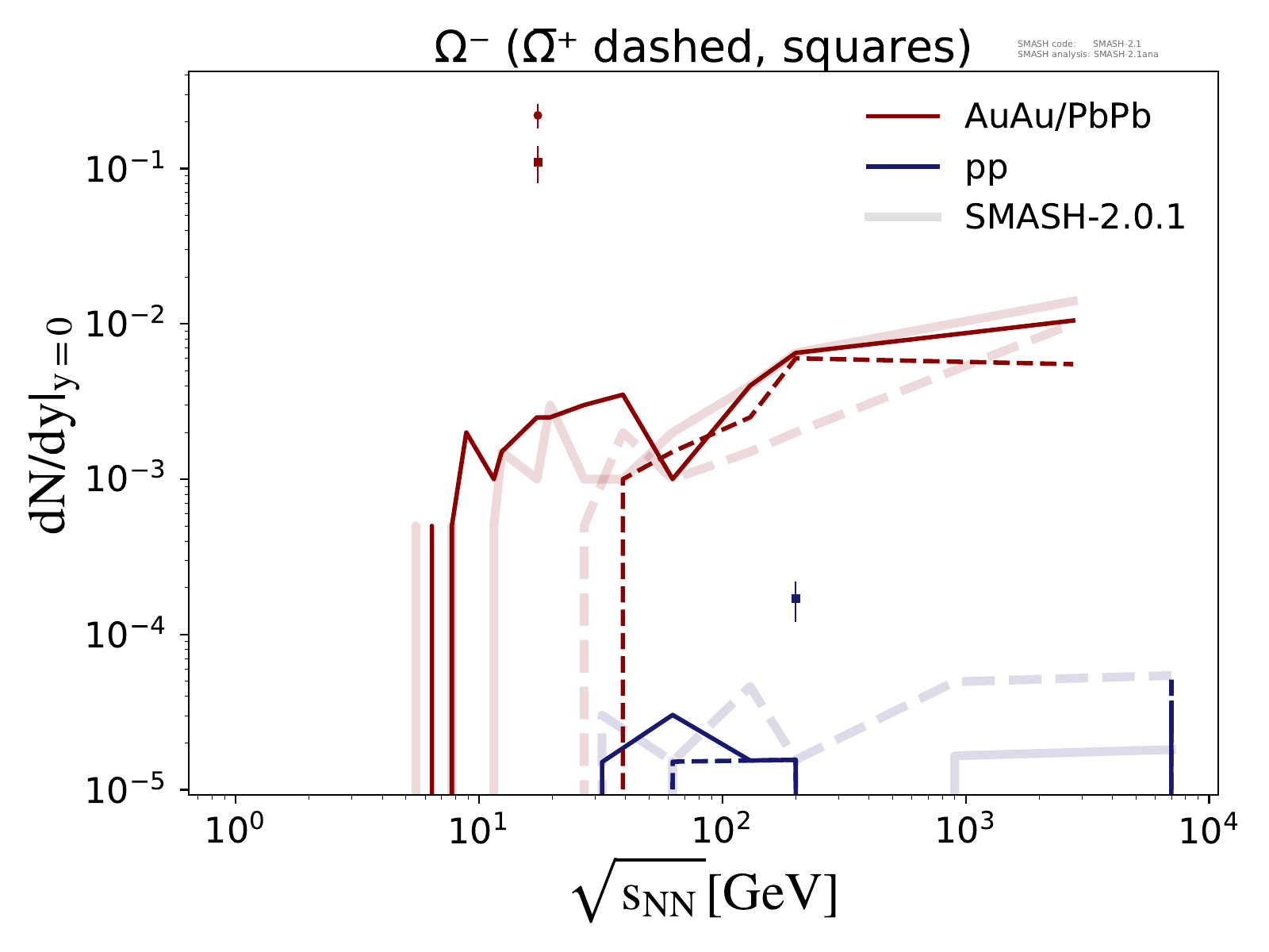 Particle yields at midrapidity for π, K, P, Λ, Ξ and Ω multiplets as a function of center-of-mass energy in pp and AuAu/PbPb collisions.