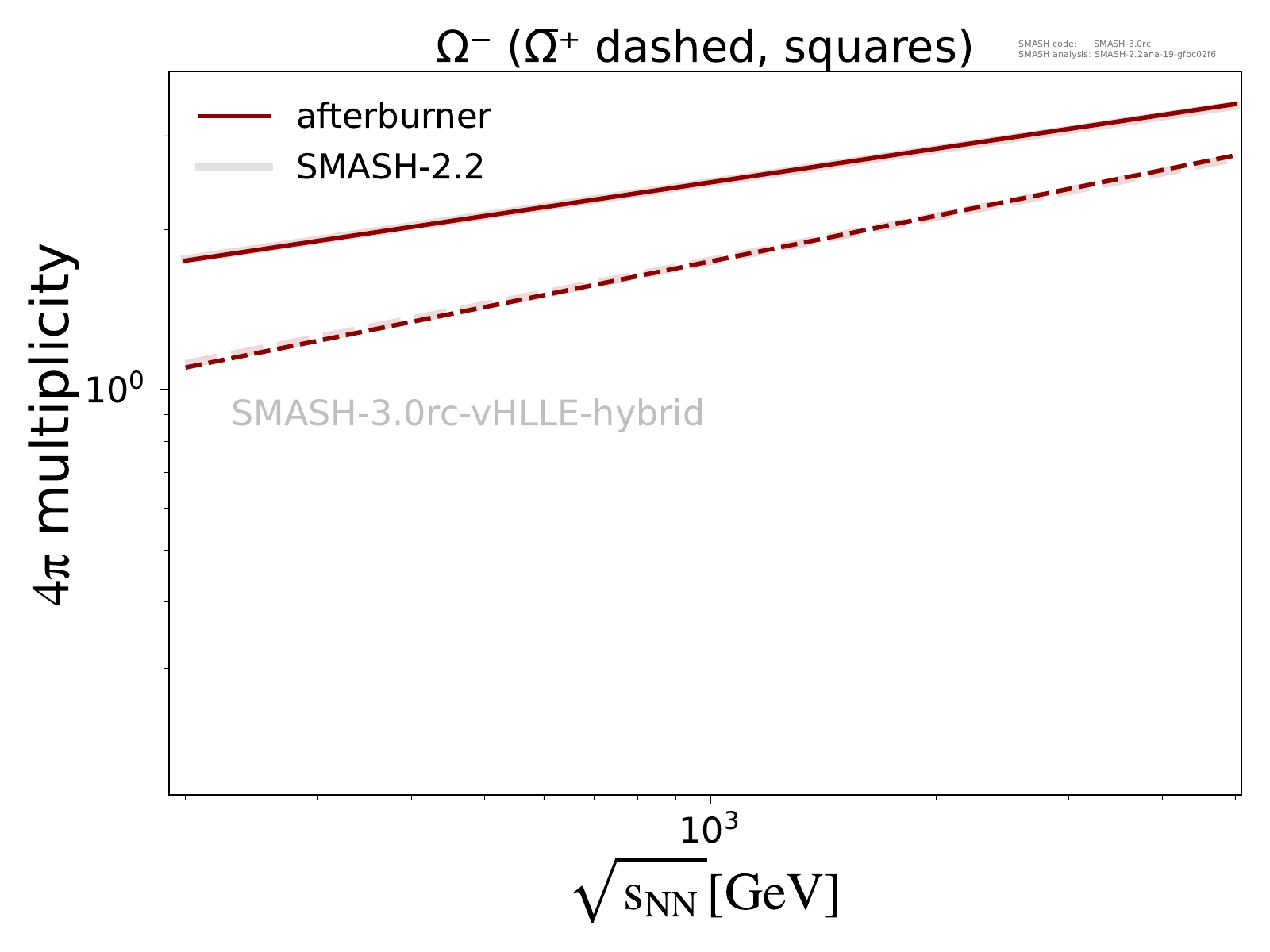 Total particle multiplicities for π, K, P, Λ, Ξ and Ω multiplets as a function of center-of-mass energy in pp and AuAu/PbPb collisions.