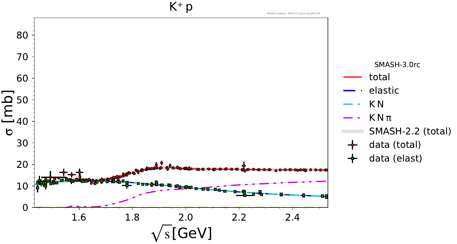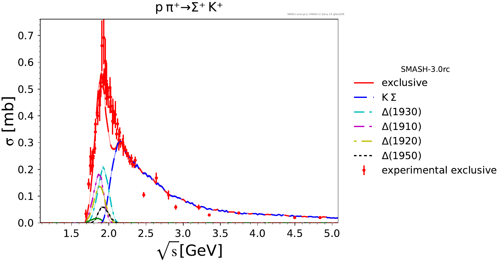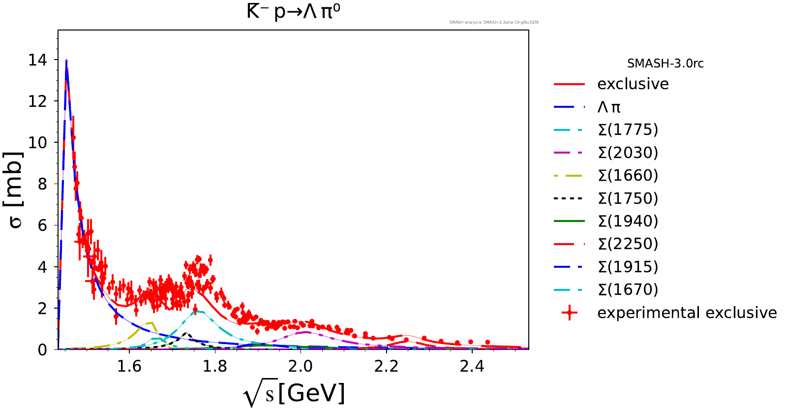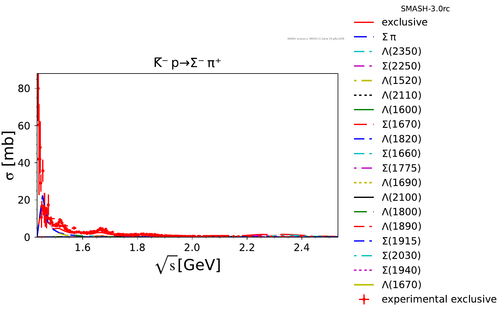 Comments: Lambda(1520) peak could be higher, but it is tightly constrained by PDG branching ratios. At high energies, there are no resonances.