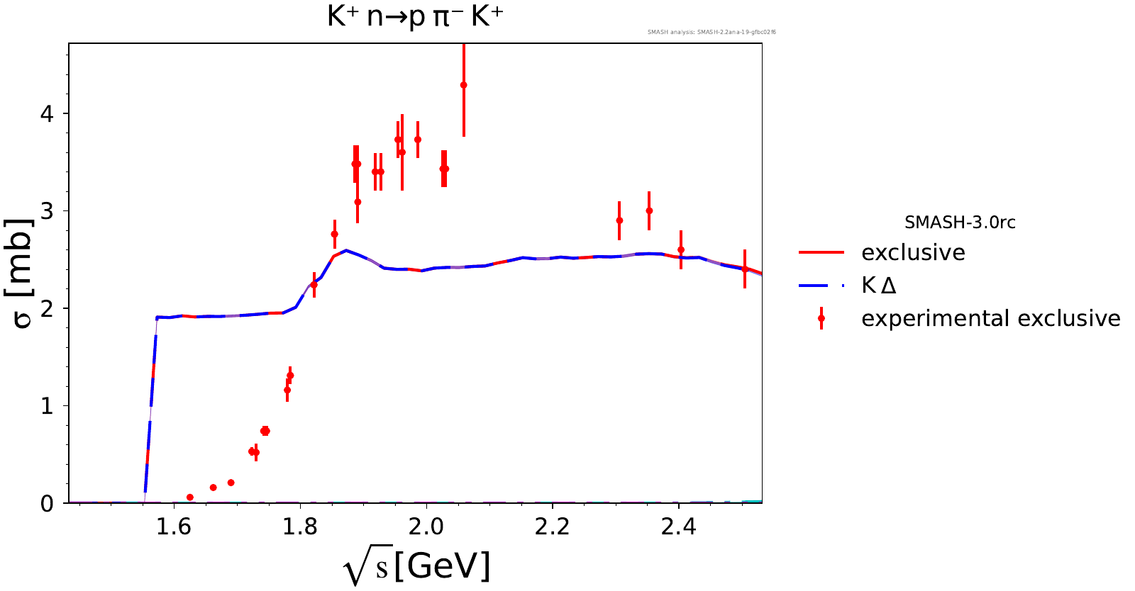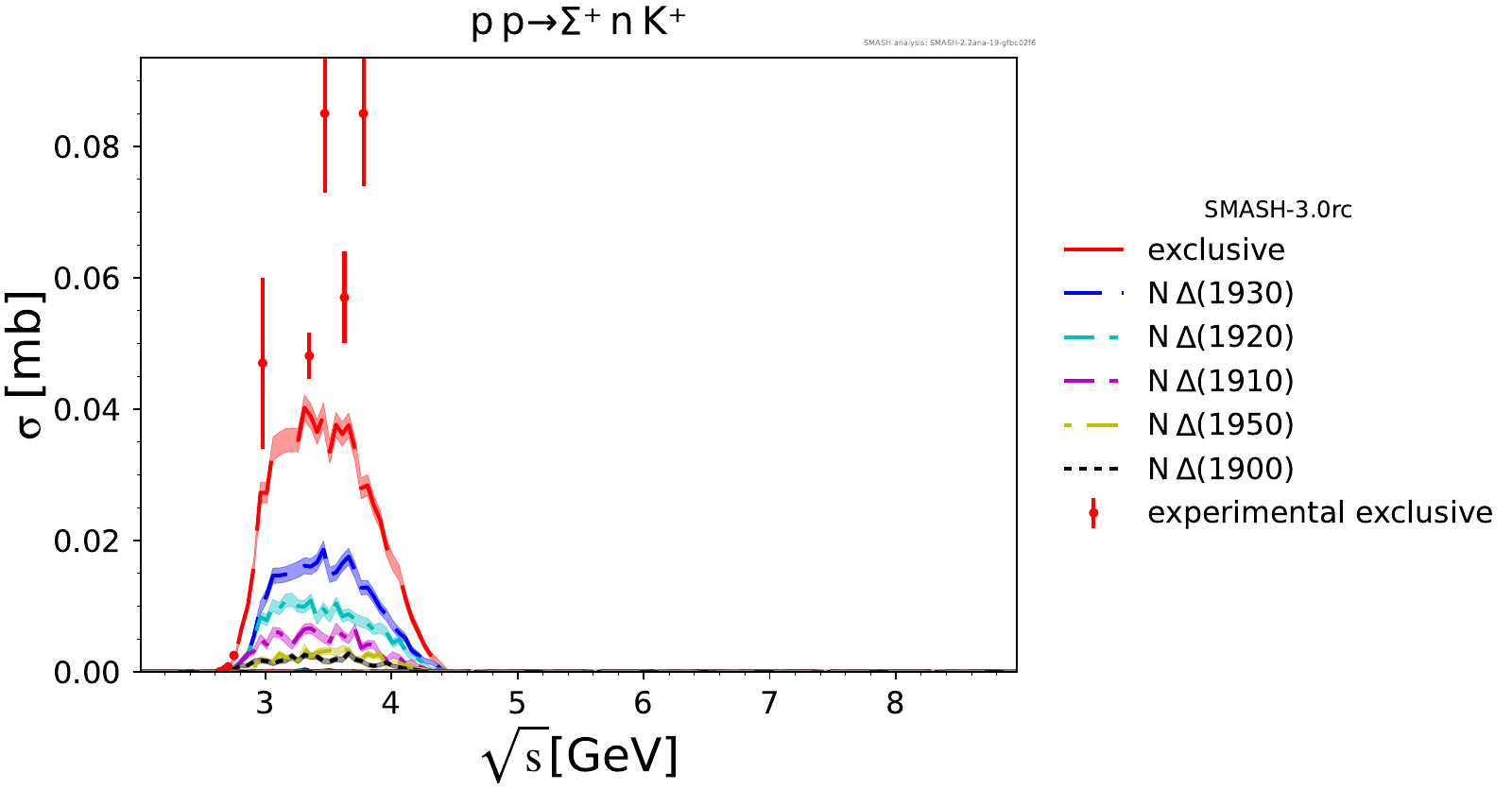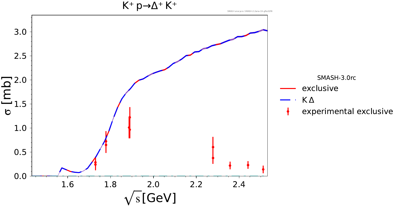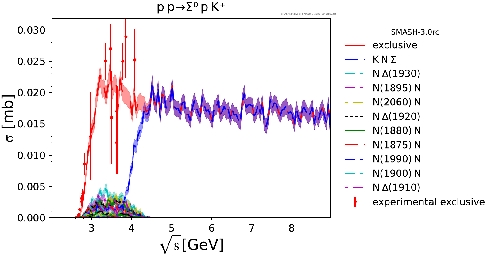 Comments: Lambda(1520) peak could be higher, but it is tightly constrained by PDG branching ratios. At high energies, there are no resonances.