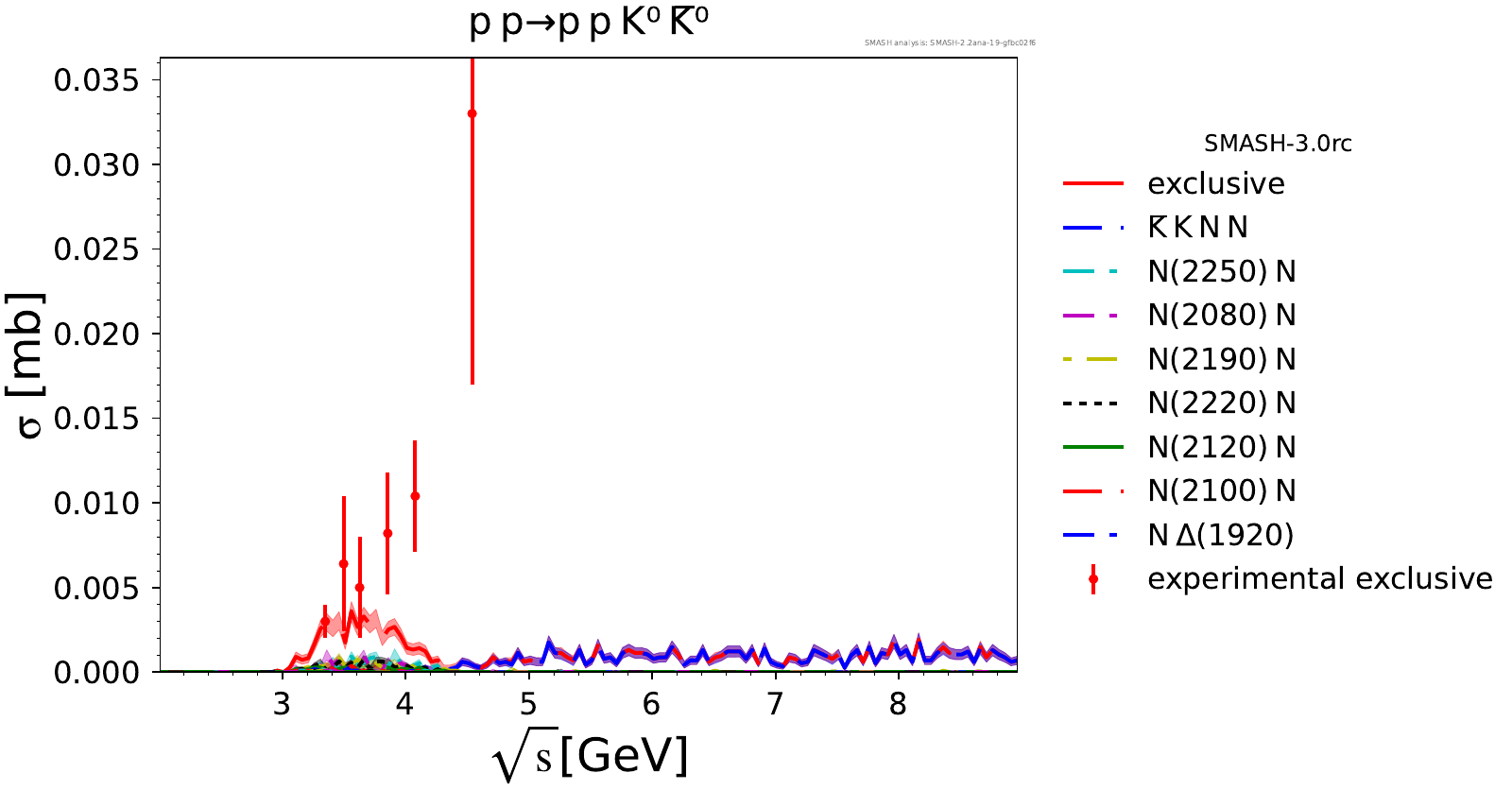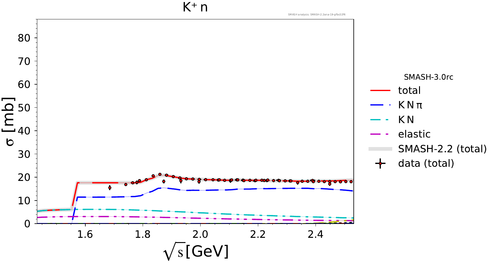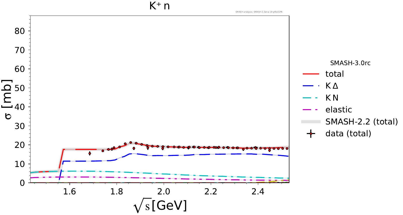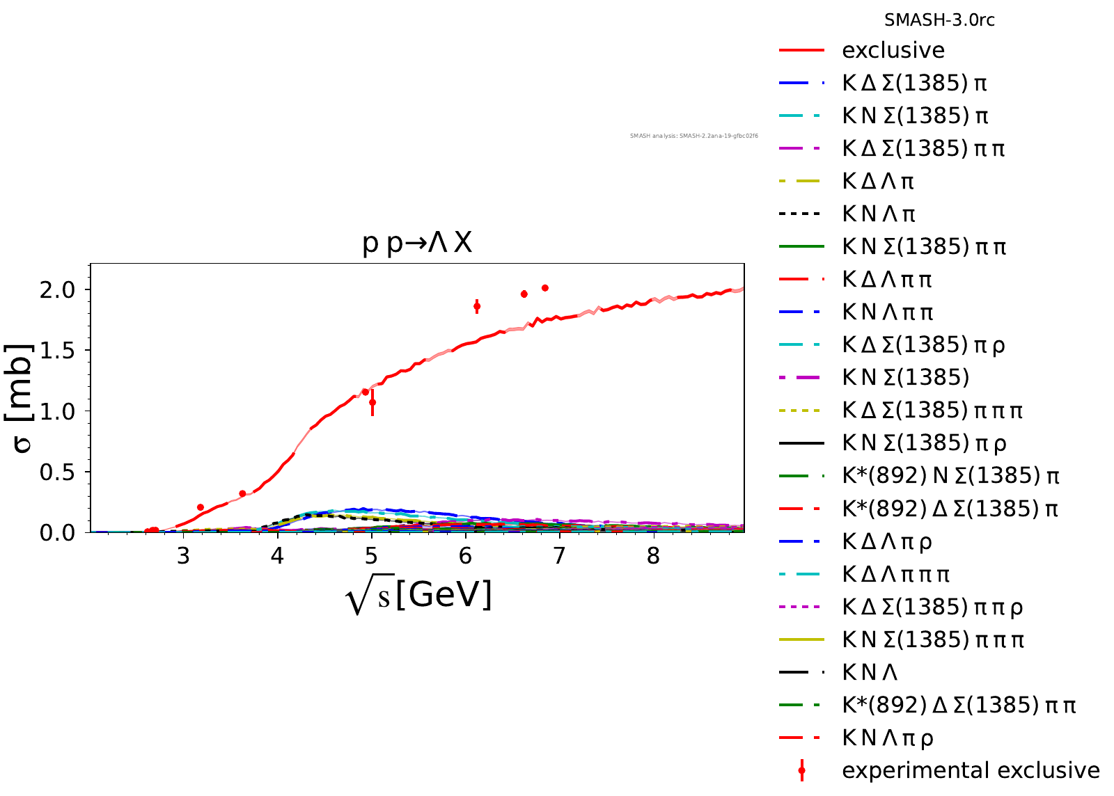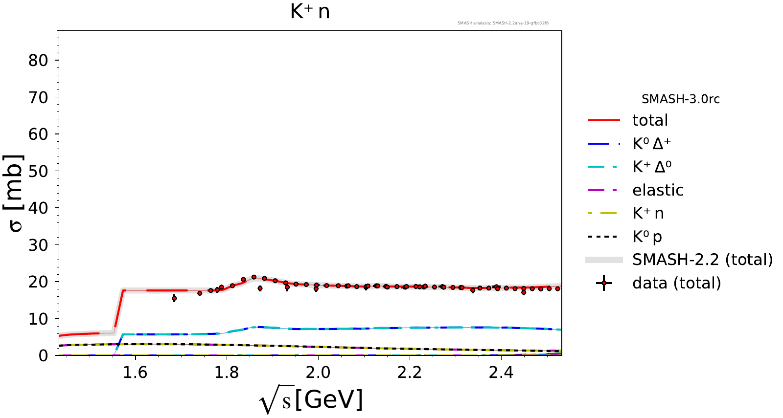 Comments: Lambda(1520) peak could be higher, but it is tightly constrained by PDG branching ratios. At high energies, there are no resonances.