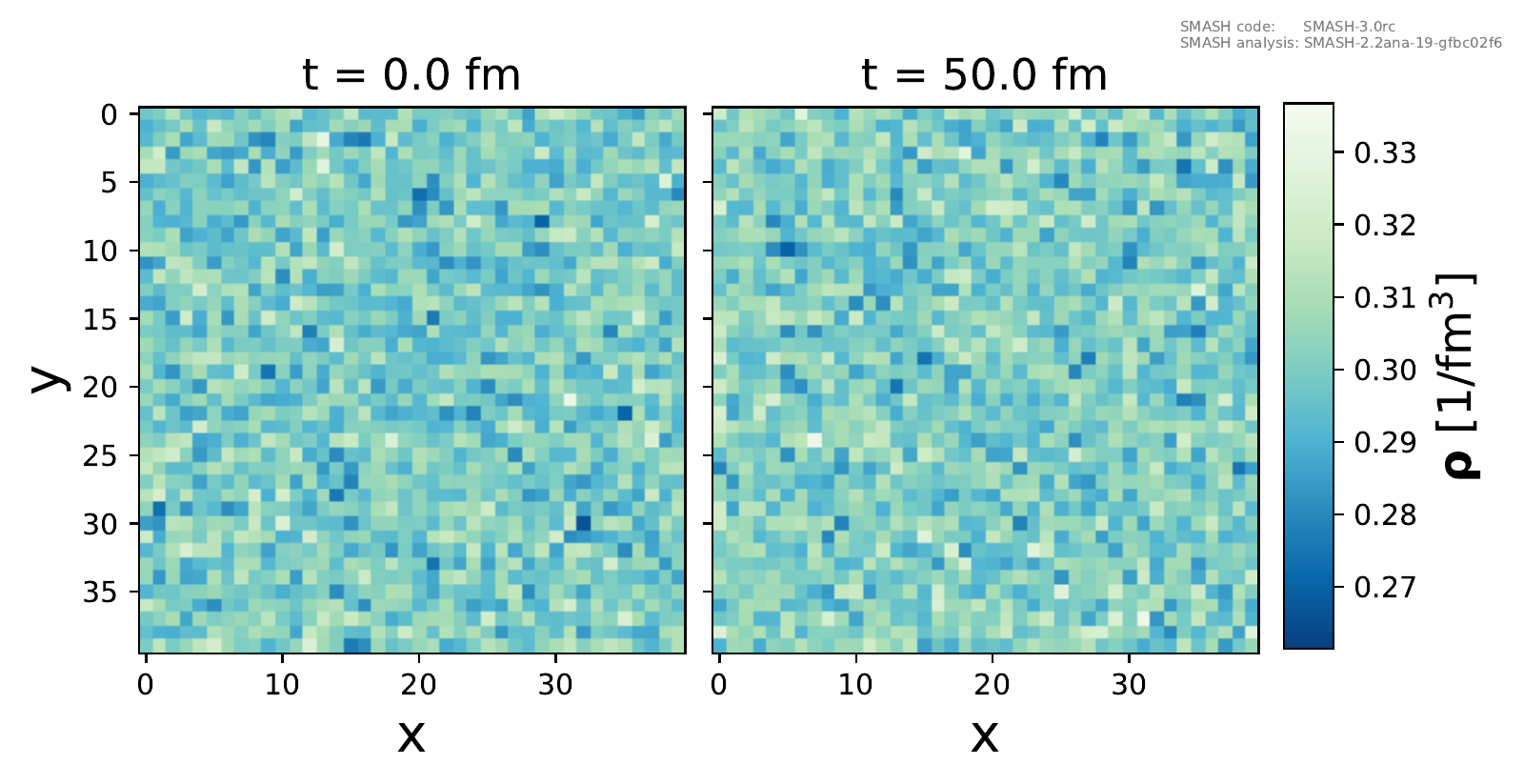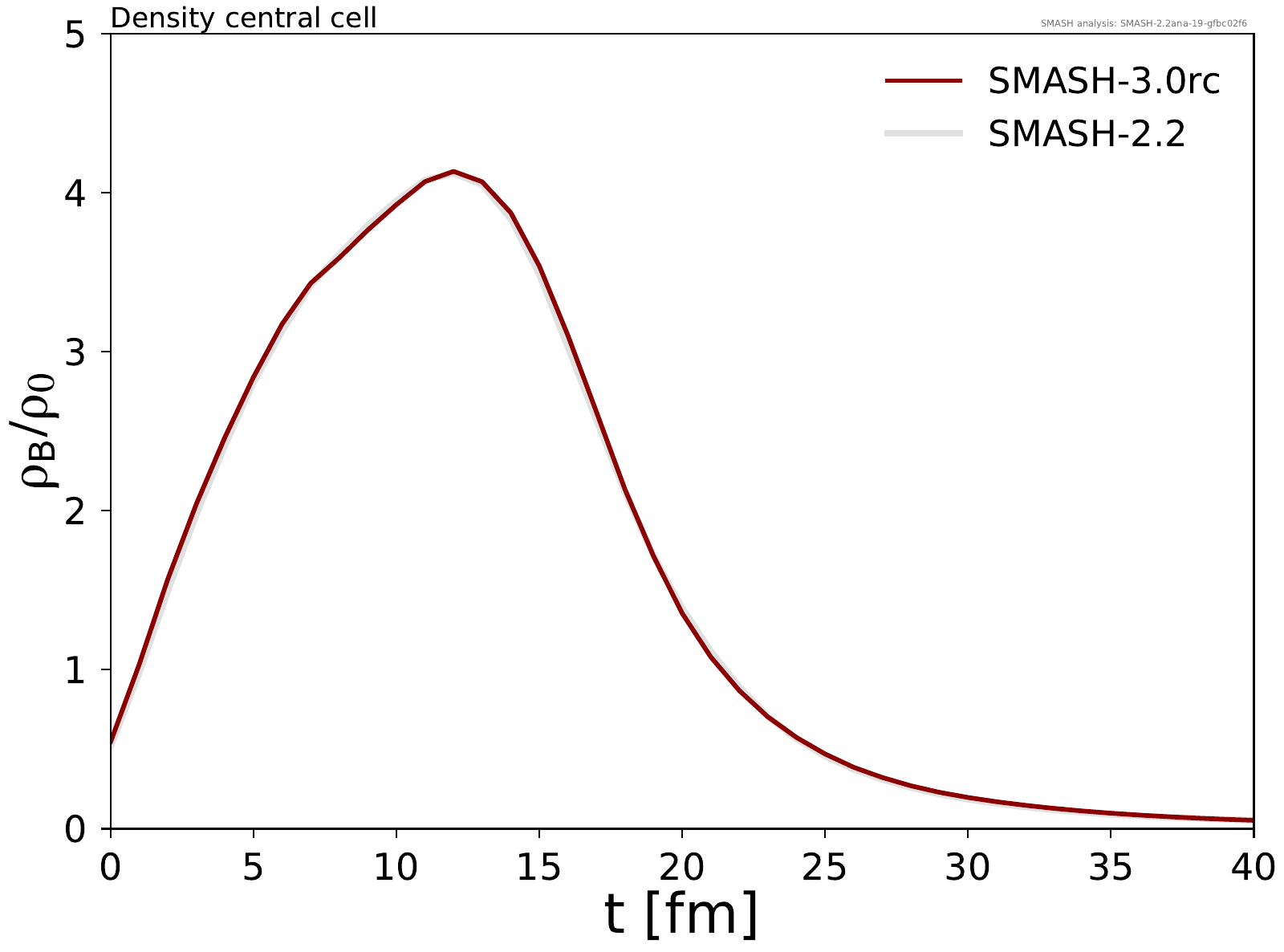 Time evolution of the baryon density in the central cell of a Au + Au collision and of the particle density in infinite matter simulations (box) for different degrees of freedom.
