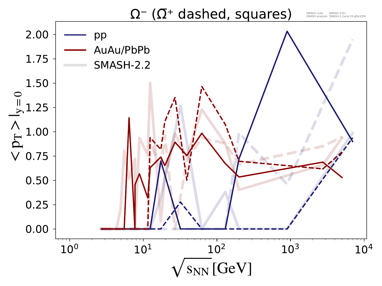 Mean transverse momentum at midrapidity for π, K, P, Λ, Ξ and Ω multiplets as a function of center-of-mass energy in pp and AuAu/PbPb collisions.