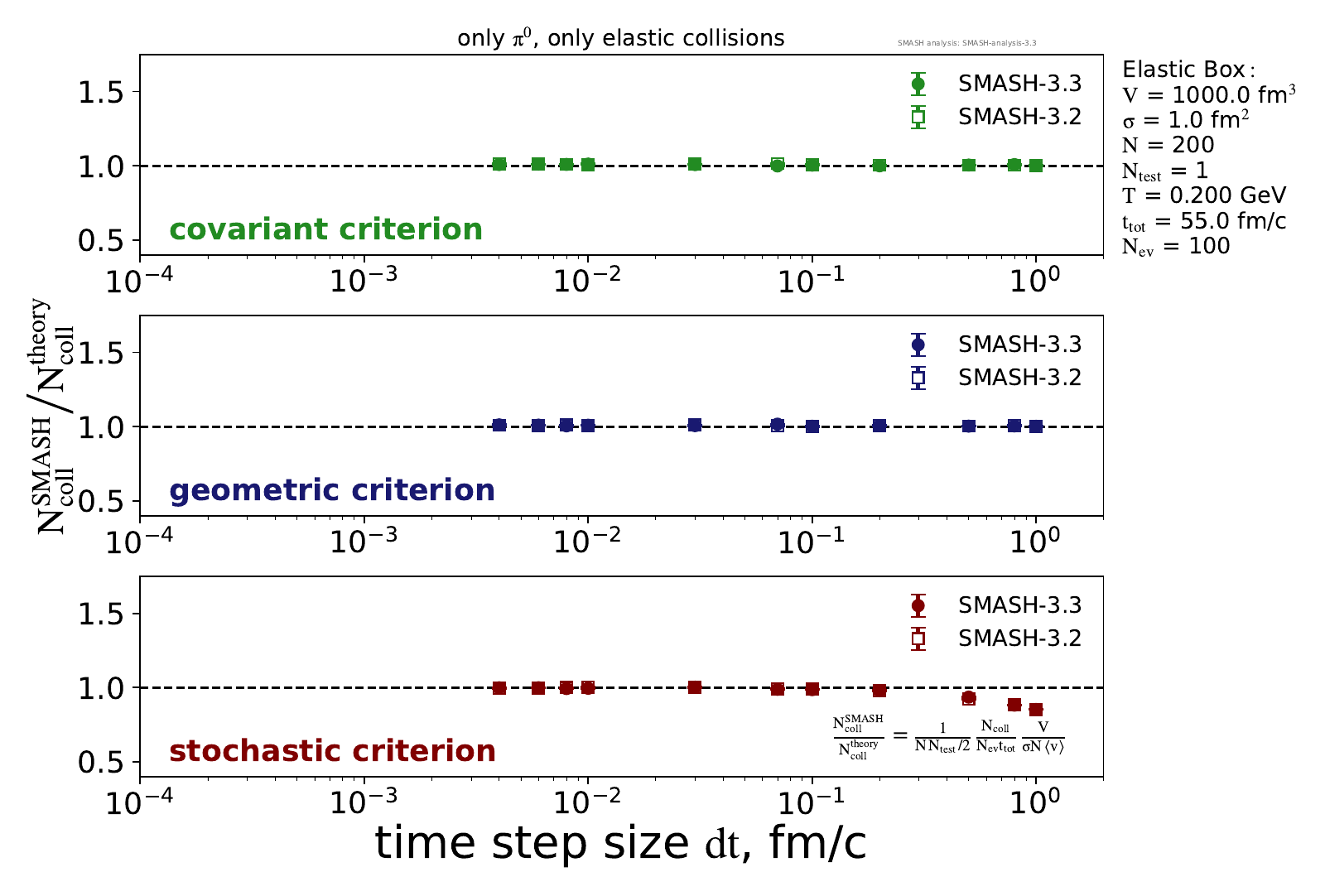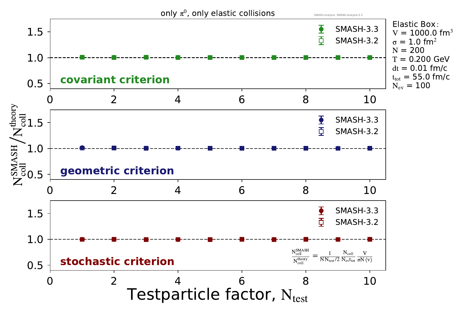 Analysis of scattering rates in infinite matter simulations with only elastic collisions. Sensitivity of scattering rates to variation of different setup parameters is investigated. The number of collisions in SMASH is, in the following plots, normalized to the theoretically expected number of collisions of a dilute gas: Nevents t σ N2 Ntest <vrel> / (2 V) We therefore expect this value at ≈ 1.0.