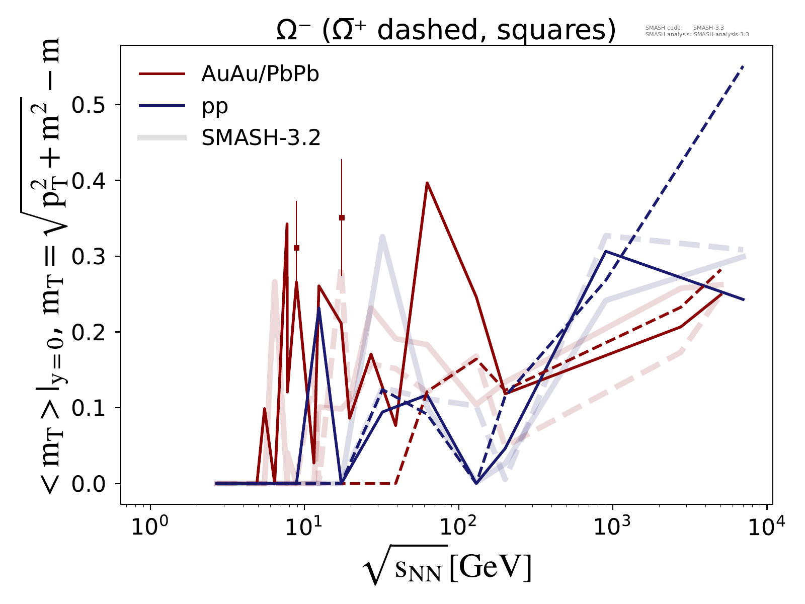 Mean transverse mass at midrapidity for π, K, P, Λ, Ξ and Ω multiplets as a function of center-of-mass energy in pp and AuAu/PbPb collisions.
