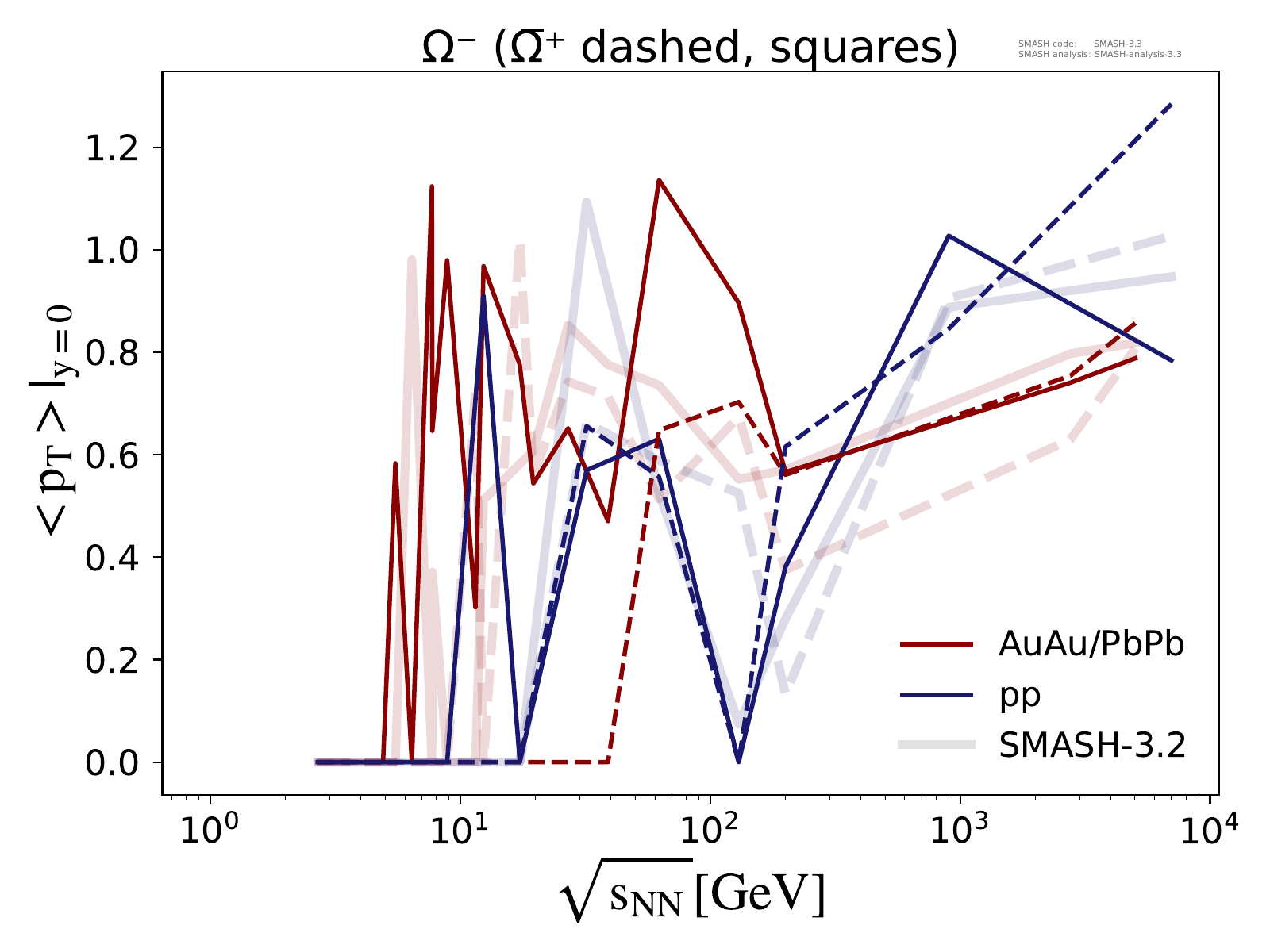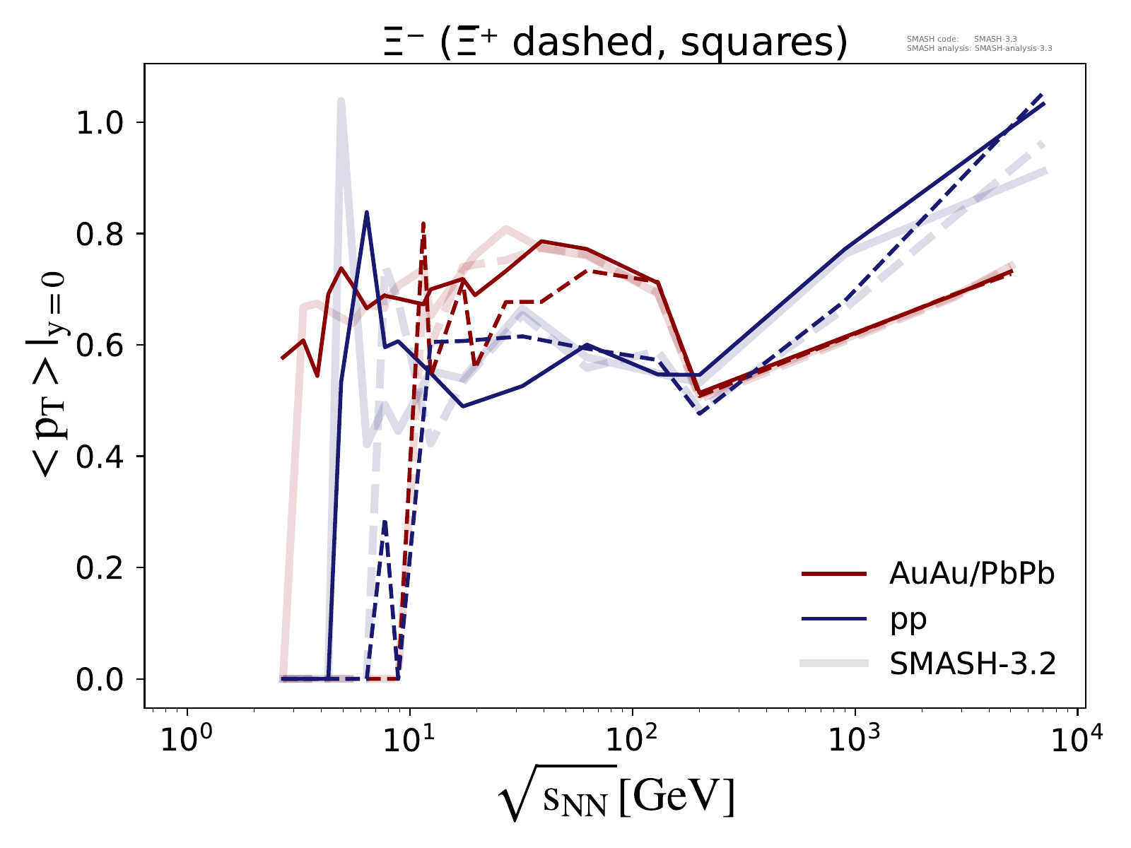 Mean transverse momentum at midrapidity for π, K, P, Λ, Ξ and Ω multiplets as a function of center-of-mass energy in pp and AuAu/PbPb collisions.